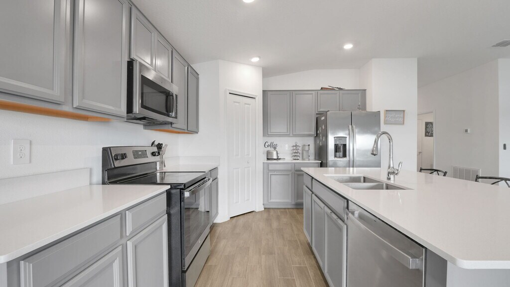 Don't miss this fantastic opportunity to rent a like-new home in the desirable Old Hickory community of St. Cloud. This beautiful home features four bedrooms, two bathrooms, and nearly 2,000 square feet of living space. Interior features include 9'-4” ceilings, ample lighting, ceramic tile flooring from the front door and throughout the common areas and carpet in the bedrooms. The modern kitchen boasts stainless-steel appliances, a corner pantry, and a large island with bar top seating. The adjacent living room and dining room make this area great for relaxing or entertaining. The master suite offers a great view of the pond, and the master bathroom features dual vanities, a walk-in shower and a large walk-in closet. Equipped with solar panels, you are set to start enjoying the energy savings from day one of owning this home! This property will allow up to 2 small pets weighing less than 25 pounds each, subject to pet screening and approval of HOA and Owner. If pet is approved, there will be a $300 non-refundable pet fee plus an additional $30 monthly fee each pet. Tenant will be responsible for a solar fee of $63 per month. Lawn care is included in the rent!