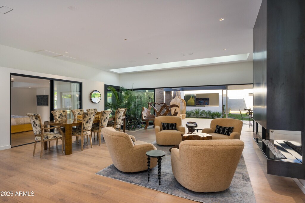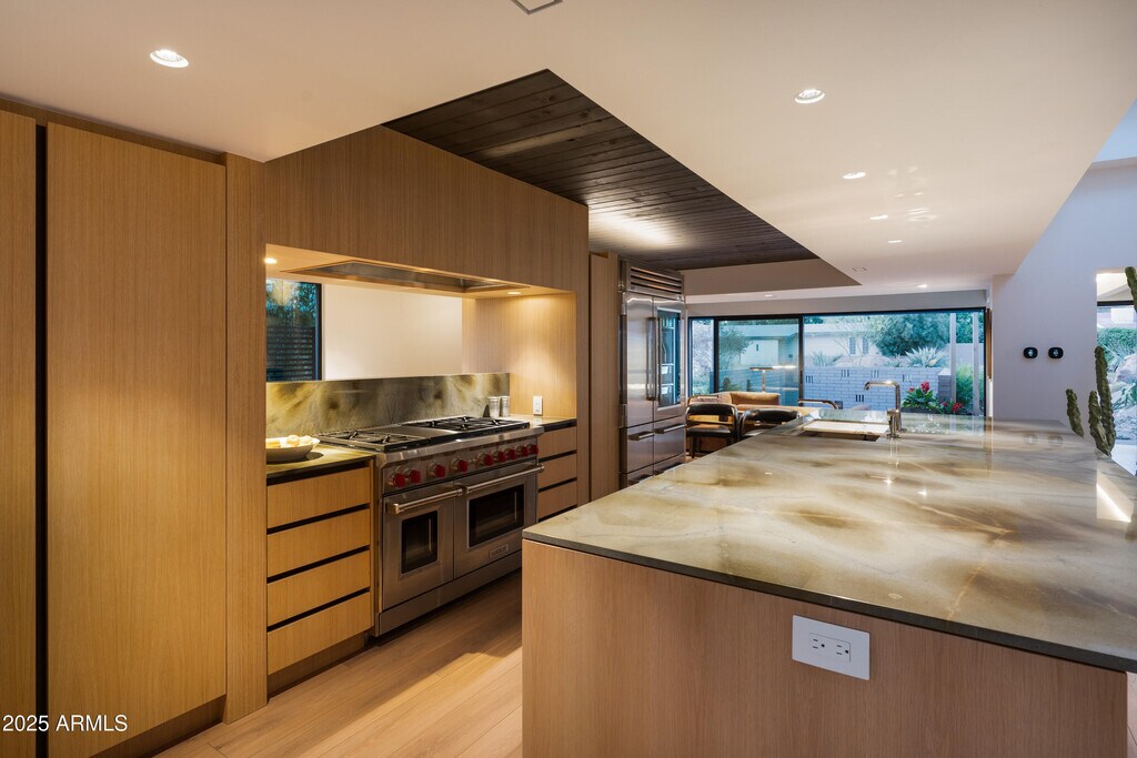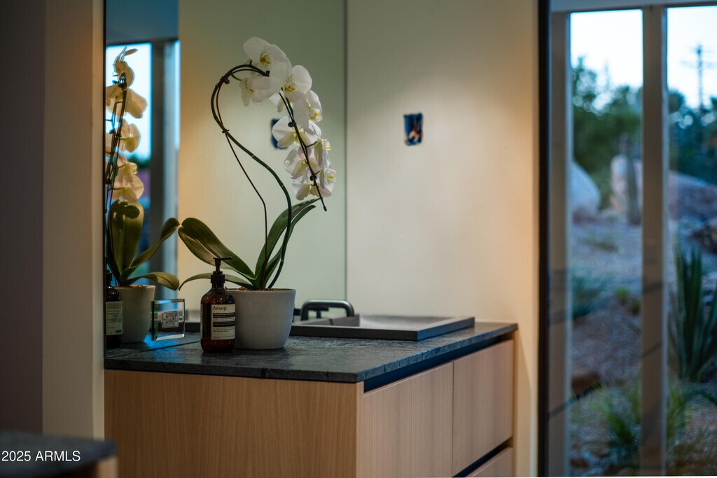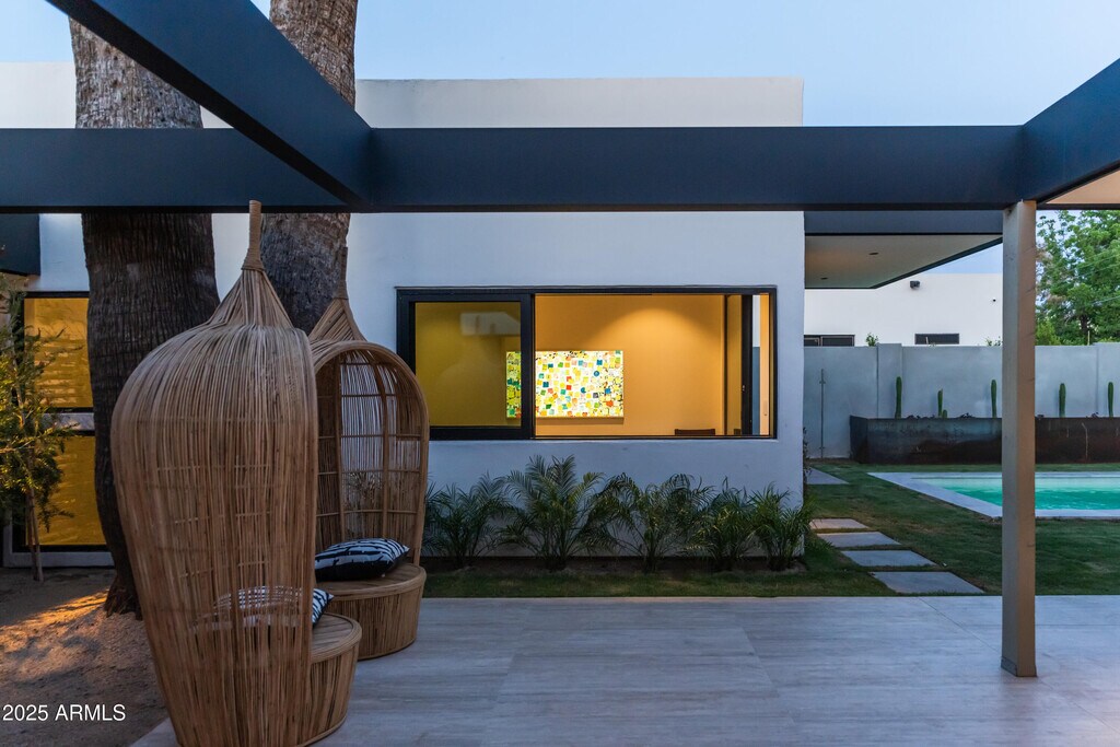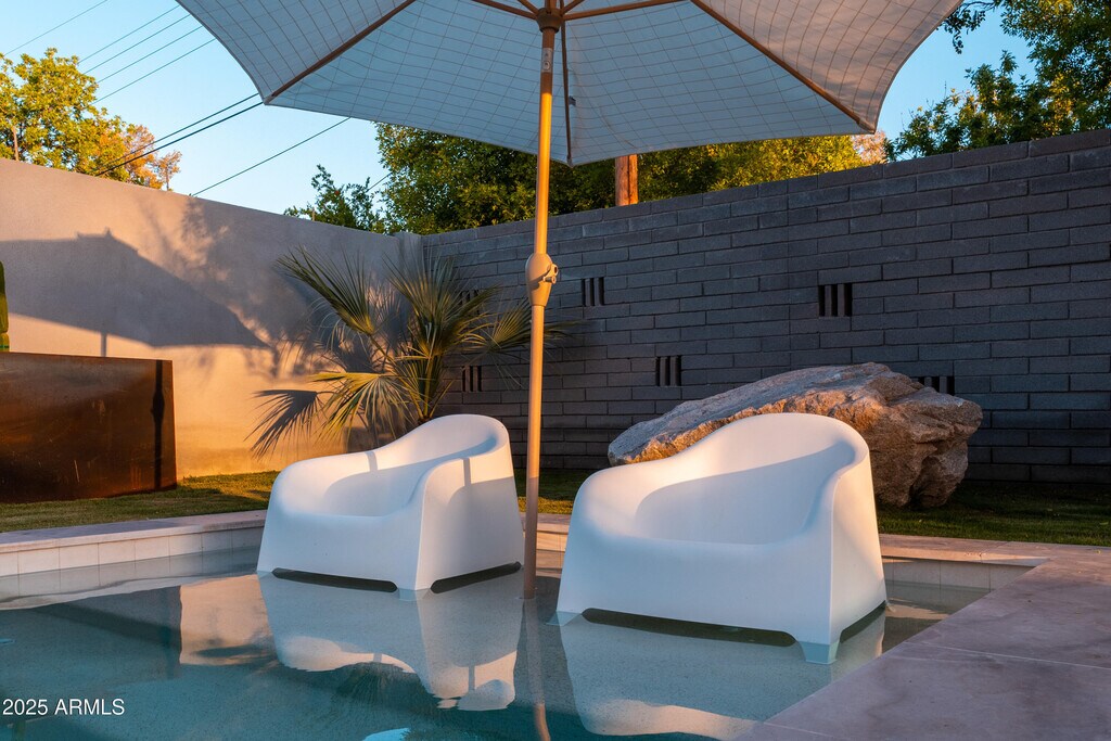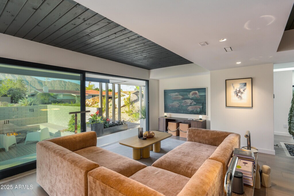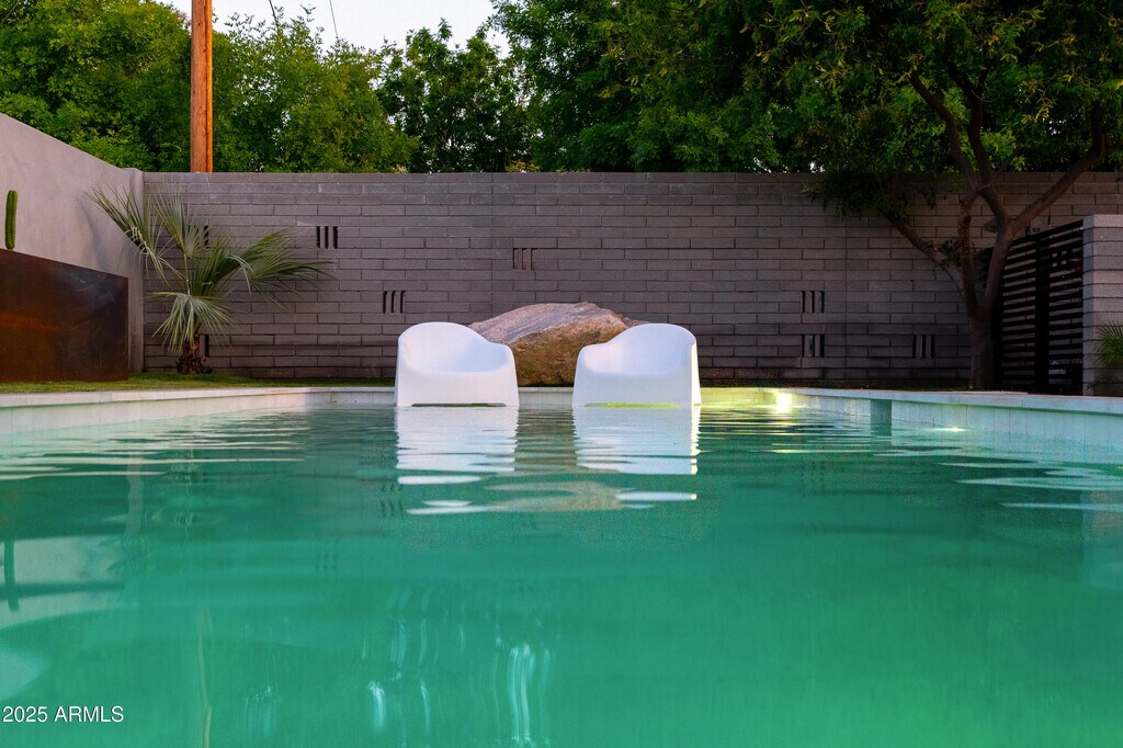 Mid-century icon originally dreamed by William B. Scarbro and reborn by PHX Historic,this residence blurs art,architecture,and landscape. Professionally sculpted grounds wrap the home in desert theater with towering palms,carved boulders,and curated plantings framing every sightline. Inside,a sun-washed great room reveals blonde hardwoods,rift-cut white oak millwork,and slabs of blue Tortuga marble that feel almost aquatic. The culinary core features a Pro-48 Sub-Zero,Wolf 48'' gas range,scullery,and paneled Cove dishwasher. The main house hosts a primary suite with ¾ bath,two guest rooms joined by a jack-and-jill,office,laundry,and a powder mural. A private casita adds a family lounge,bedroom,and ¾ bath. Indoors dissolve into the pool,fenced grounds,and 60-year palms.
