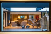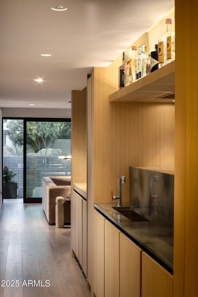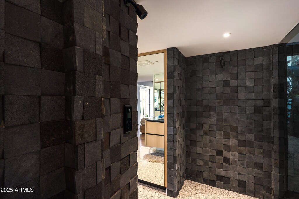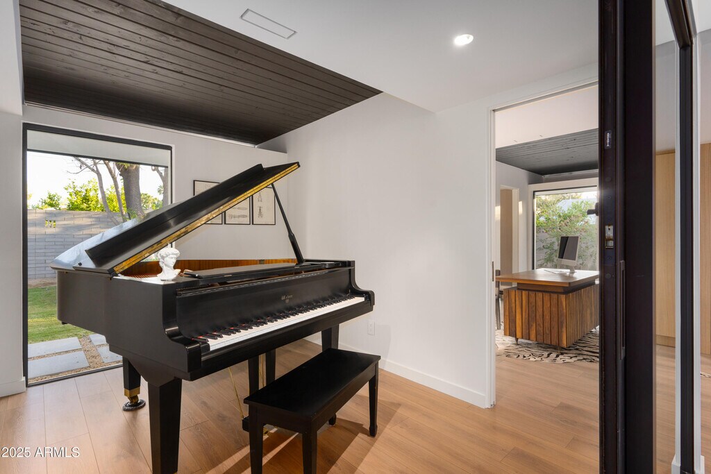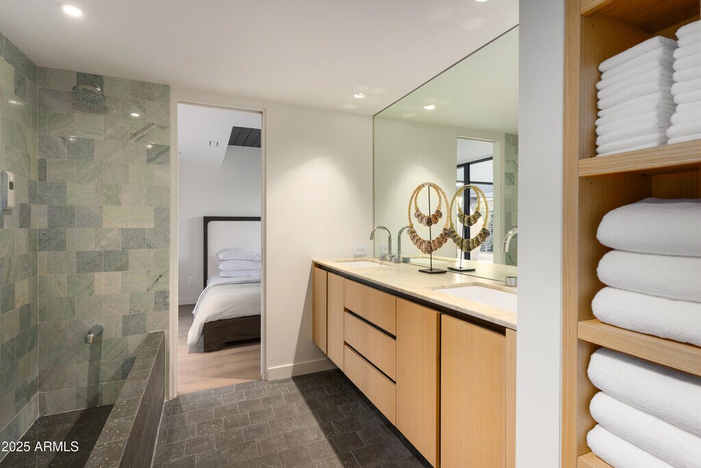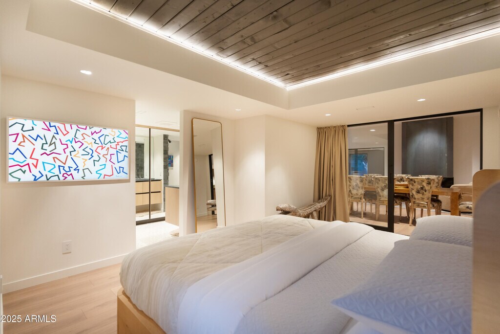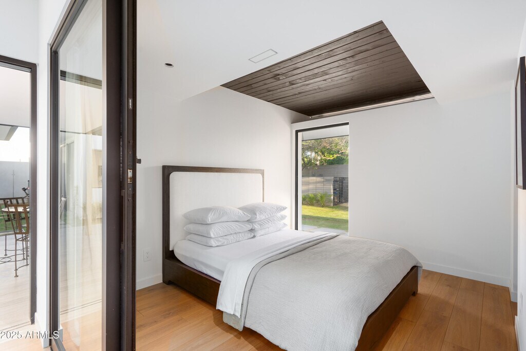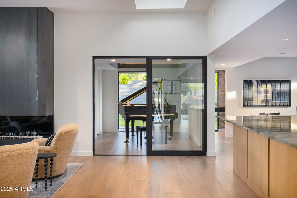 Mid-century icon originally dreamed by William B. Scarbro and reborn by PHX Historic,this residence blurs art,architecture,and landscape. Professionally sculpted grounds wrap the home in desert theater with towering palms,carved boulders,and curated plantings framing every sightline. Inside,a sun-washed great room reveals blonde hardwoods,rift-cut white oak millwork,and slabs of blue Tortuga marble that feel almost aquatic. The culinary core features a Pro-48 Sub-Zero,Wolf 48'' gas range,scullery,and paneled Cove dishwasher. The main house hosts a primary suite with ¾ bath,two guest rooms joined by a jack-and-jill,office,laundry,and a powder mural. A private casita adds a family lounge,bedroom,and ¾ bath. Indoors dissolve into the pool,fenced grounds,and 60-year palms.