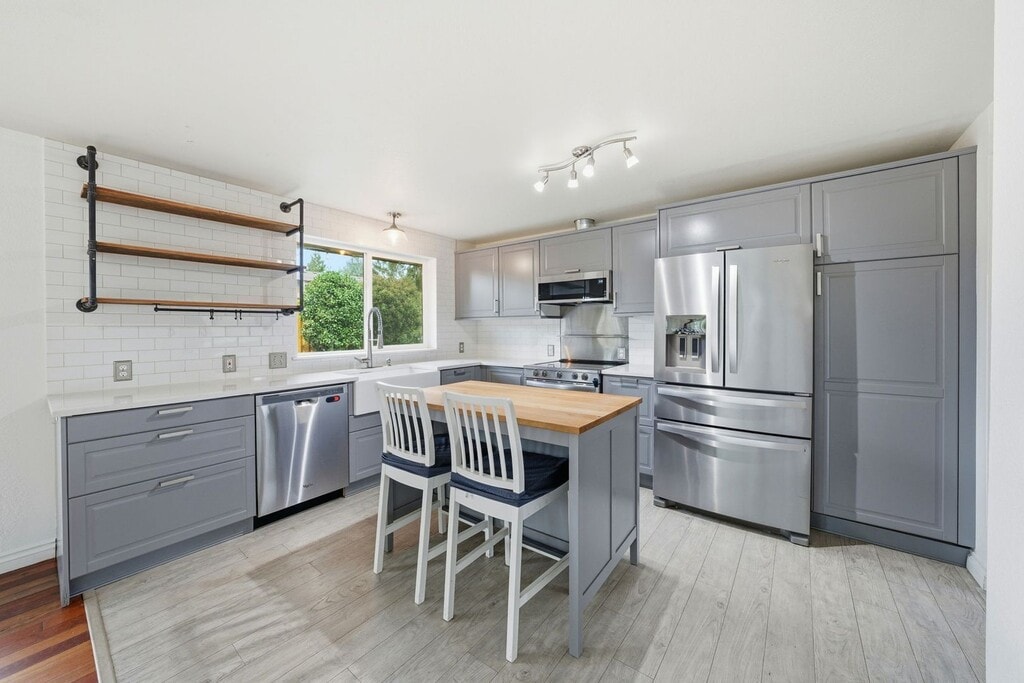 This inviting 3-bedroom, 2-bath home sits on an extra-large 14,850 sqft lot just minutes from shops and under 30 minutes to Seattle. Inside, you’ll love the open-concept kitchen and living room, vaulted ceilings, cherry floors, and spacious family room. The primary suite features an updated en suite bath with a double-head shower, while wide hallways and doorways create great flow throughout. An updated kitchen with beautiful cabinetry, hard floors, wood-burning stove, and electric gate entrance add both charm and convenience.