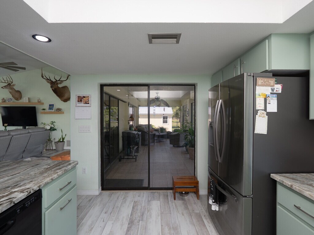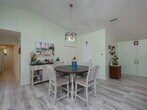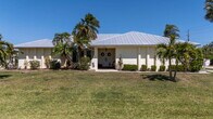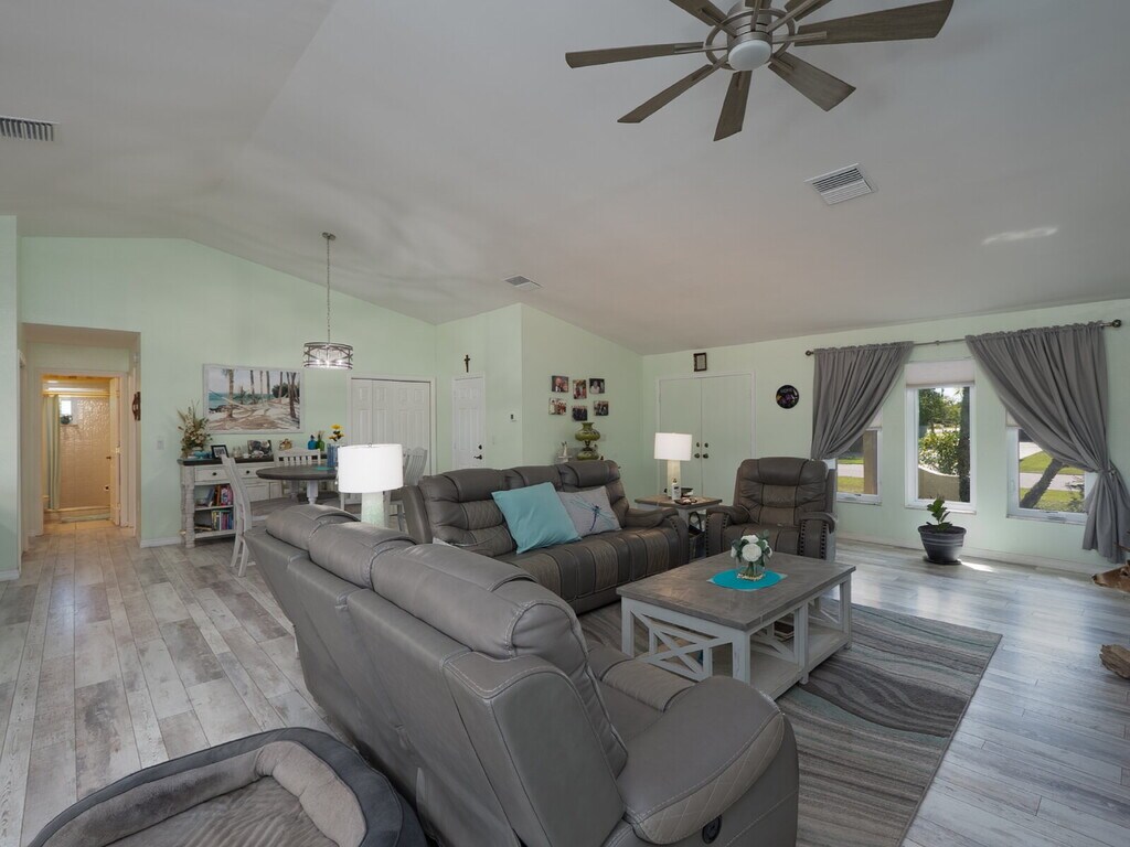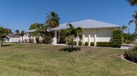 Welcome to this beautifully maintained 3-bedroom, 2-bath pool home available on a 12-month lease, ideally situated in the established Gulf Cove community. Positioned on an oversized corner lot near the canal, this water-facing property offers a unique sense of openness, privacy, and flexibility with no mandatory HOA. The wide spacing between neighboring homes and peaceful setting create a relaxed coastal atmosphere without the added responsibilities of direct waterfront ownership. Inside, vaulted ceilings and an open-concept layout create a bright, airy feel, while wide-plank flooring flows throughout the main living areas, complementing the coastal color palette and abundant natural light. The spacious living and dining areas connect seamlessly, making the home comfortable for everyday living and ideal for entertaining. The kitchen is centrally located and features generous cabinetry, stone countertops, stainless steel appliances, and a breakfast bar that opens to the main living space. Sliding glass doors lead to the covered lanai, creating an effortless transition to outdoor living. The primary suite offers a comfortable retreat with ample space and a private ensuite bath featuring a walk-in shower. Guest bedrooms are thoughtfully arranged in a split floor plan, providing privacy and flexibility for visitors, family, or a home office, along with a convenient pool bath for easy outdoor access. Step outside to your private Florida oasis, where a resurfaced pool and brick paver deck overlook tranquil water views, surrounded by mature palms and tropical landscaping. Wrought-iron fencing enhances privacy, while the expansive side yard offers rare flexibility with room for boat or RV storage, outdoor entertaining, or additional use. A matching shed adds valuable storage or workshop space. Residents of Gulf Cove have the option to join the voluntary HOA, which provides access to a community boat ramp, waterfront park, playground, and pavilion—allowing you to enjoy boating and outdoor amenities without mandatory fees. With a newer metal roof, impact windows, and thoughtful updates throughout, this home delivers comfort, space, and a true Florida lifestyle in a highly desirable location.