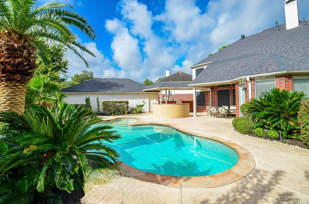 Sharlene AbgharyExperience the allure of this stunning 4-bedroom, 3.5-bath home nestled on a quiet cul-de-sac. The backyard is a true paradise with a beautiful pool, palm trees, spa, outdoor bar, and expansive decking for shaded relaxation. A charming covered patio invites you to enjoy summer days by the pool or mornings with a cup of coffee. Inside, the spacious high-ceiling family room seamlessly connects to the kitchen, offering abundant natural light and featuring granite counters, ample cabinets, and stainless-steel appliances. The generous master bedroom boasts pool views, complemented by a private bathroom with quartz countertops, a separate shower and tub, and double sinks. A convenient home office on the main level and sizable secondary bedrooms upstairs, along with a game room, ensure ample space for every need. Additional highlights include a three-car garage, proximity to excellent schools and a junior high within walking distance, plus easy access to Westpark Toll, Highway 99, and I-10.