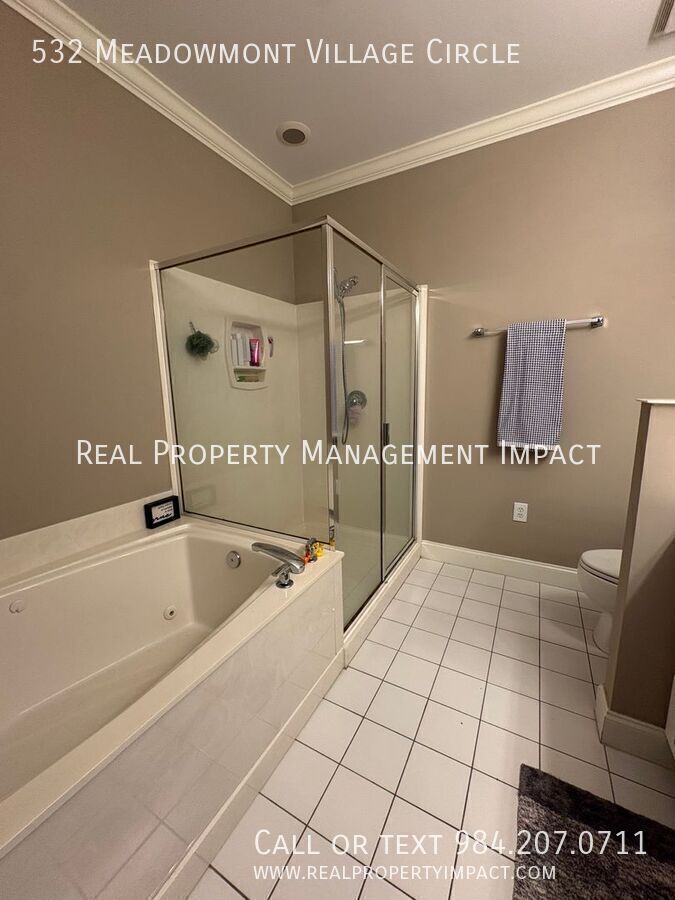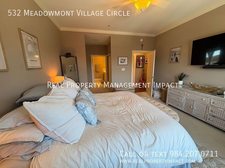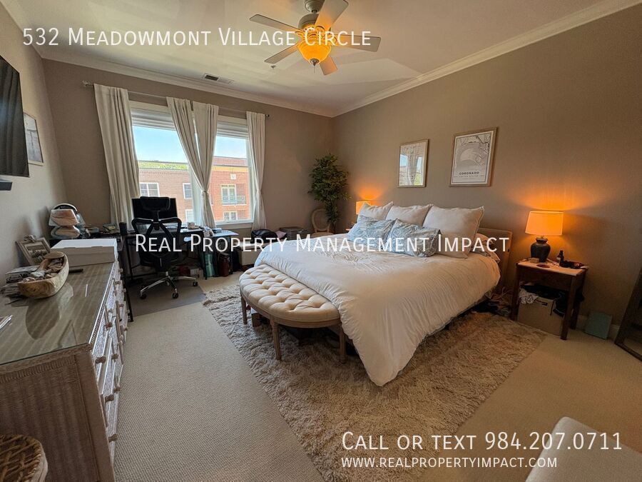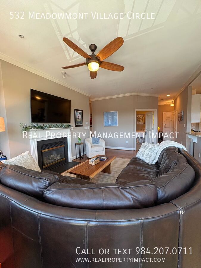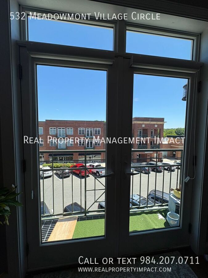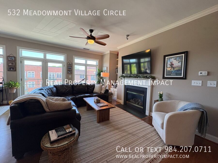 Welcome to this exceptional third-floor condo nestled in the heart of Chapel Hill's coveted Meadowmont Village — one of the area's most walkable and vibrant communities. Step outside your door and find yourself just a short stroll away from grocery stores, charming cafes, restaurants, parks, and scenic trails. Inside, soaring ceilings and a wall of windows flood the open living and dining space with glorious natural light, creating an airy, elevated atmosphere that feels anything but ordinary. Rich wood-style flooring runs throughout the main living areas, grounding the space with warmth and understated elegance. Slide open the doors to your private Juliet balcony and let the breeze in. It’s the perfect perch for a morning coffee or an evening unwind. The kitchen features gleaming granite countertops, crisp white shaker cabinets, and eye-catching decorative glass door accents. A farmhouse-style sink anchors the space, while a ceramic tile backsplash and gas stove make cooking a genuine pleasure. Abundant wrap-around cabinetry and countertops offer the storage and prep space that home cooks will appreciate. The living room invites you to settle in with its built-in bookshelf and cozy gas fireplace that is ideal for quiet evenings at home. A dedicated laundry area off the kitchen with a full-size washer, dryer, and generous storage adds everyday practicality. The spacious primary bedroom retreat features ample windows, dual closets, and a luxurious ensuite bath complete with a jetted soaking tub, separate shower, and refined ceramic tile finishes. A second bedroom with carpet is equally suited as a guest room or a private home office and is served by a full hallway bath. With elevator access, ample parking, and the quiet ease of condominium living, this Meadowmont Village gem delivers the very best of Chapel Hill — sophisticated, serene, and steps from everything you love. Application Criteria • Credit Score – Min 600 (soft pull) • Income (monthly) –3X Monthly Rent • Everyone over 18 must apply ($55 application fee applies to all applicants) • No Evictions • Criminal Background Screened • All information provided on the application is screened and verified. • Approval timeline varies based on the verification process. Average = 48 hours. AVOID RENTAL SCAMS: Real Property Management Impact is a licensed Real Estate Agency that exclusively markets and represents this listing. We do not advertise on Craigslist or Personal FB Pages. We would never ask you to wire money, request funds through a payment app for initial rent, deposits, or take the key after your showing to move-in. Condo Washer/Dryer