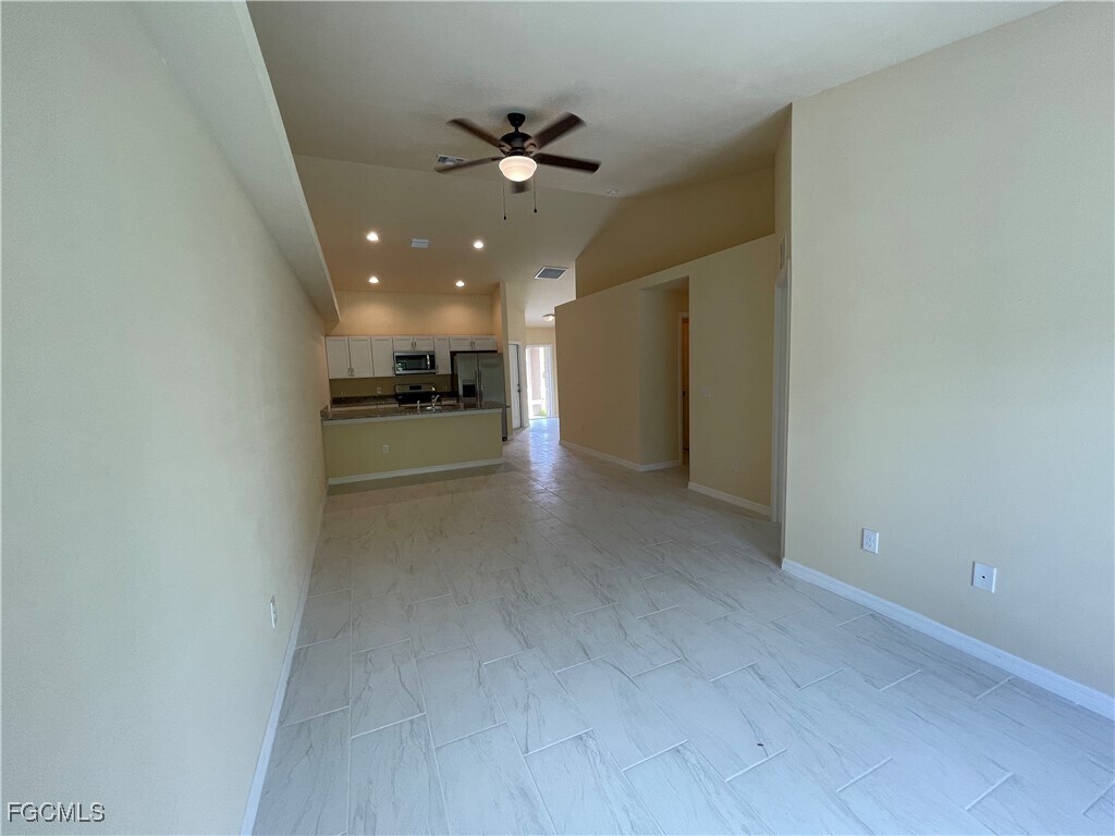 Step into this like-new home featuring a spacious open floor plan,tall ceilings,and tile floors throughout. The kitchen shines with granite countertops,stainless steel appliances,and decorative plant shelves,while the large living room is perfect for relaxing or entertaining. The application fee is $75 per person. All applicants 18+ need to apply separately. 12-month lease: $1545 18-month lease: $1495 Additional highlights include: 1-car garage Ceiling fans in every room Fantastic location just minutes from Fort Myers,shopping,dining,and more!