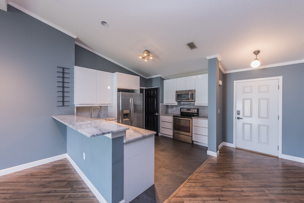 Newly remodeled 3 bedrooms, 2 bathrooms home located in a family friendly neighborhood, right around the corner from a public recreation park. Home has a modern kitchen featuring stainless steel appliances, sleek gloss cabinetry, quartz countertops and customizable accent lights. It also features crown molding and wood flooring throughout. Bathrooms have granite countertops and modern fixtures to complete the motif.