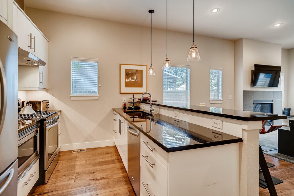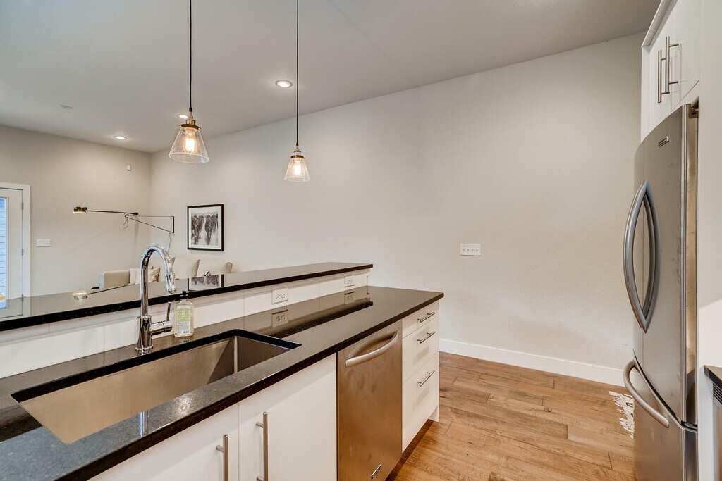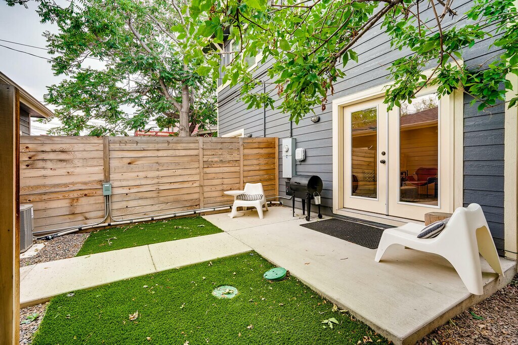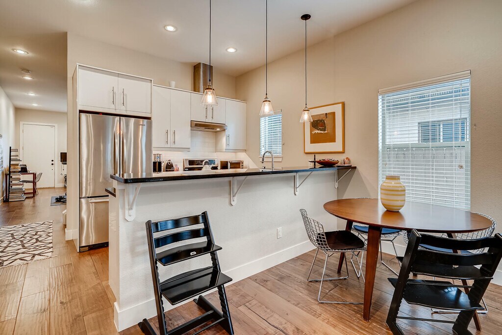 Stylish 3BR/2.5BR townhome located in Denver’s Wash Park West offers a fantastic location and off-street parking. This unit makes a great first impression with clean lines and a covered front patio with brick accents. Inside, wide plank floor and a flex area welcomes and can easily be office space or a sitting room. The sleek kitchen has clean, lacquered white cabinets, and SS fridge, oversized sink, dishwasher, microwave and 5 burner gas range. The adjoining family room includes a gas fireplace, space for a large TV and French doors with access to the low- maintenance backyard. Upstairs, a large master with great closet space and an attached bathroom with shower. Two additional bedrooms share a full bathroom upstairs along with W/D closet. Off-street parking includes a detached 1-car garage and an extra space next to the garage. One block to Starbucks, grocery stores and more. Easy freeway access. Style and a convenient location makes this townhome a great find!