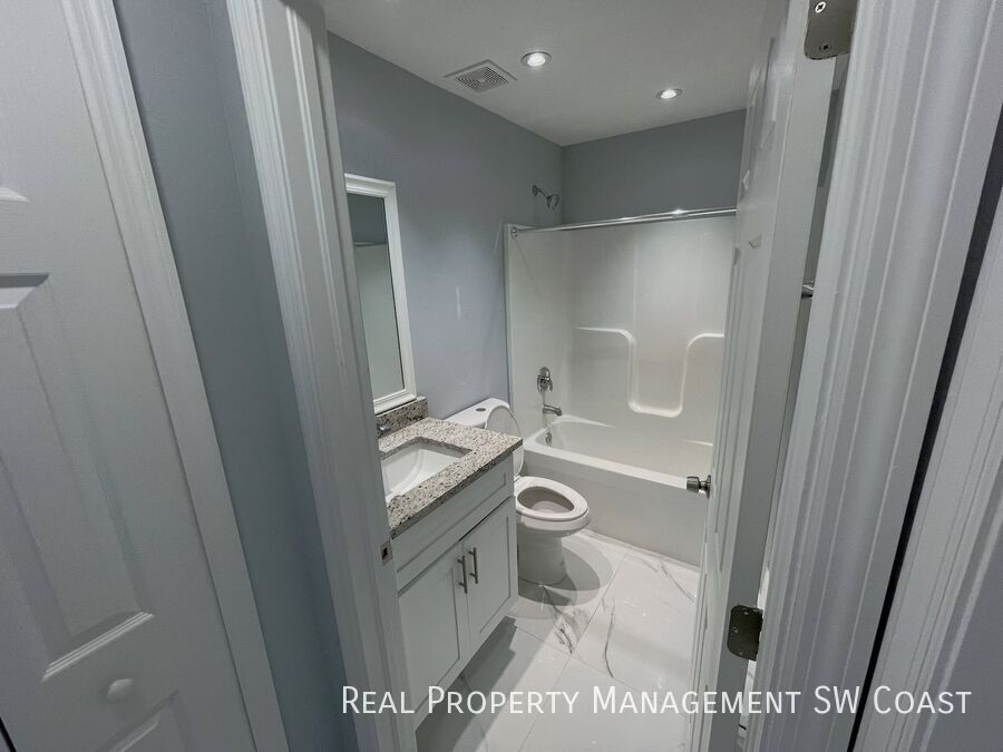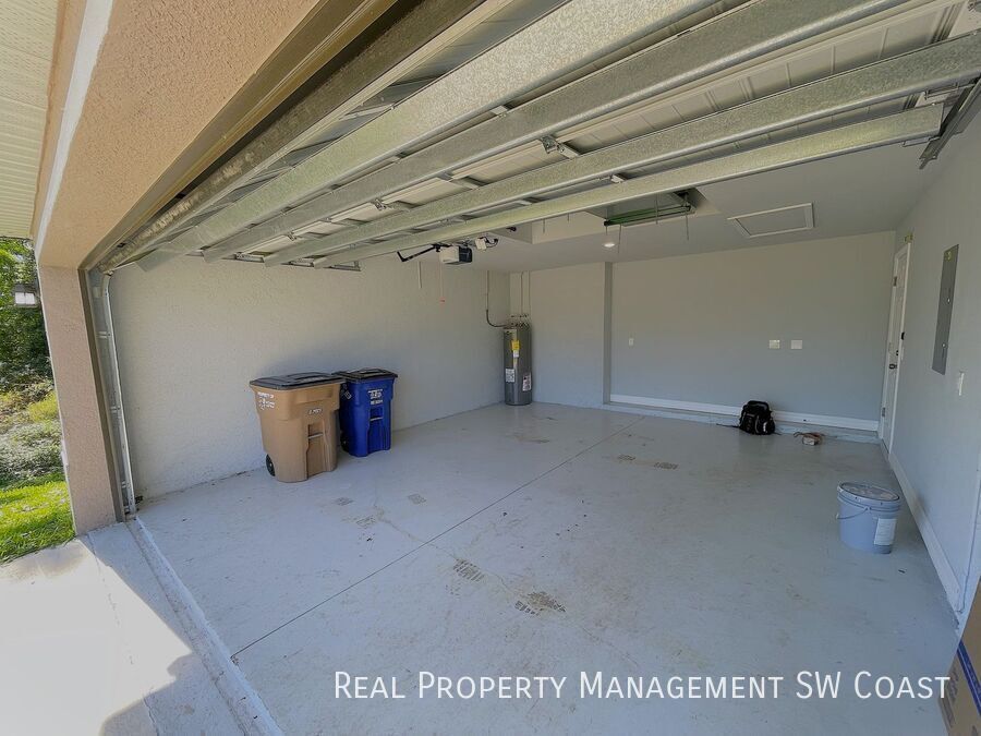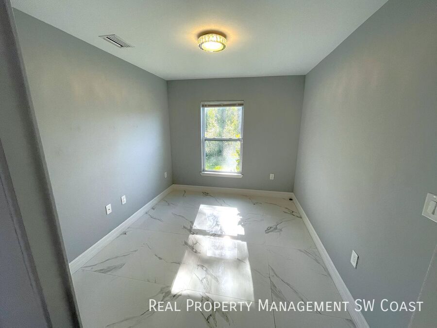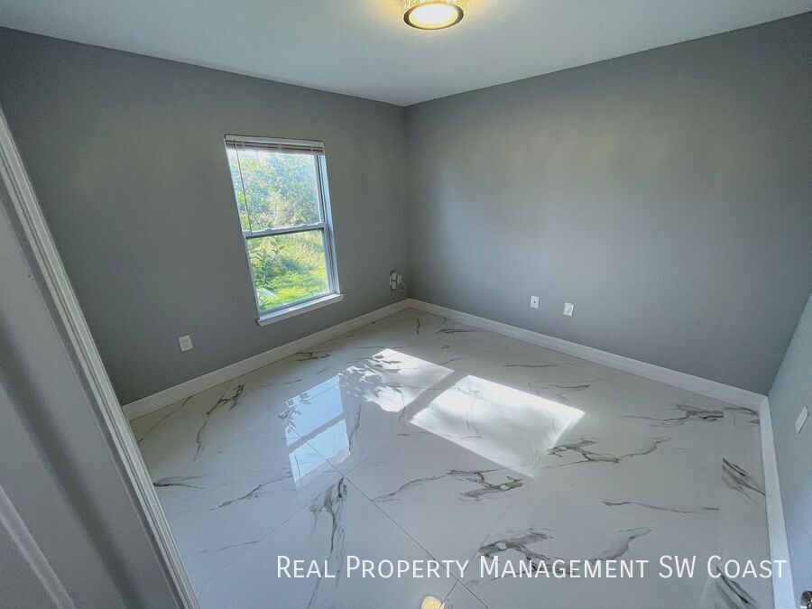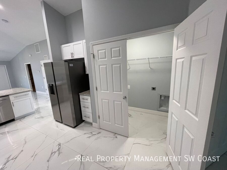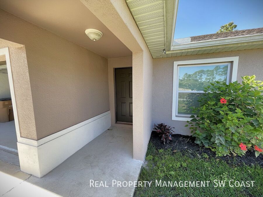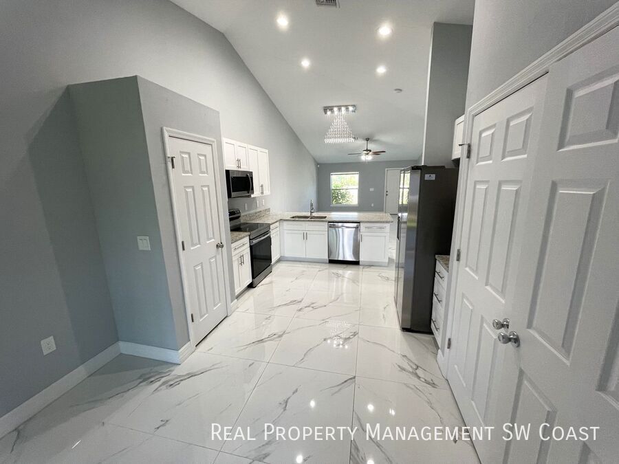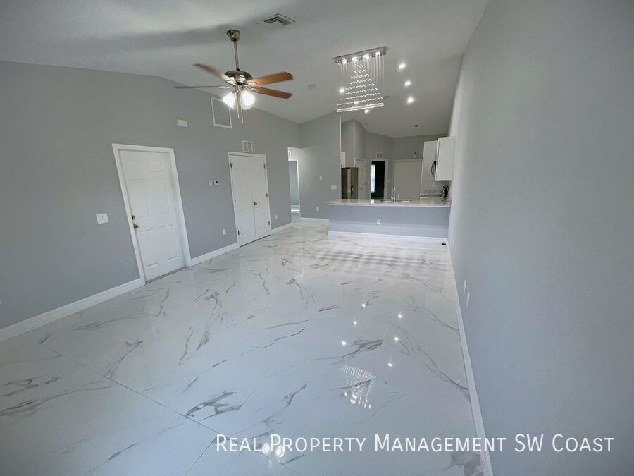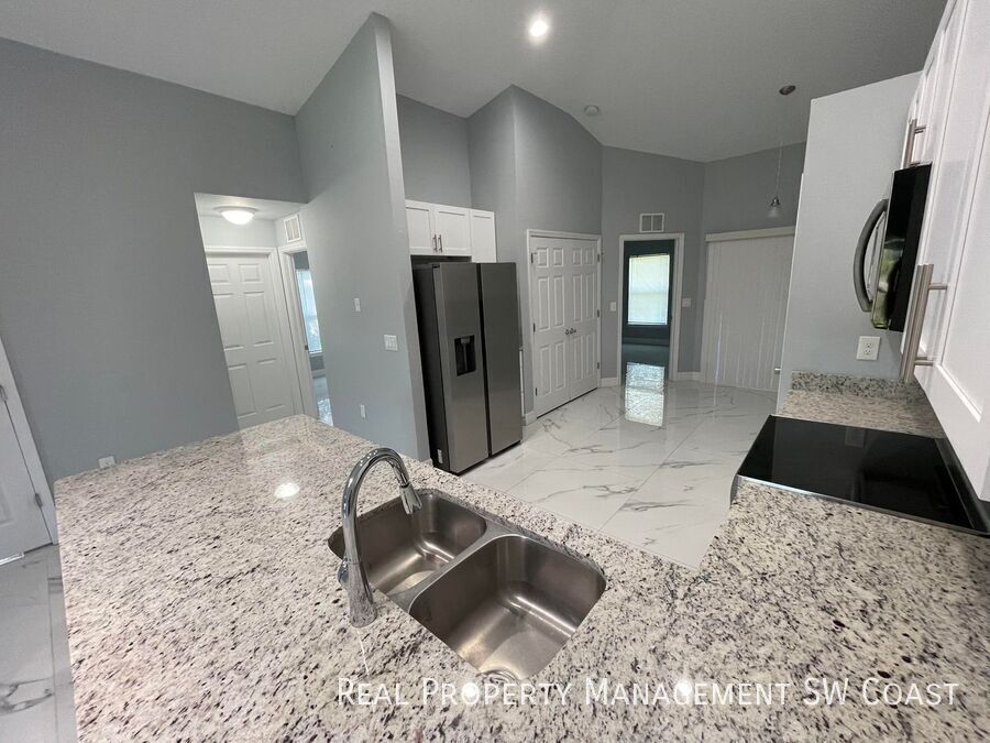 Looking for the perfect rental home? This beautifully maintained 3-bedroom, 2-bathroom home in Lehigh Acres offers a spacious and comfortable living experience in a quiet neighborhood. Step inside to an open floor plan with high ceilings and plenty of natural light. The modern kitchen features updated appliances, ample counter space, and a breakfast bar, perfect for cooking and entertaining. The bright and airy living and dining areas provide plenty of room to relax. The primary suite boasts a walk-in closet and a private en-suite bathroom with dual vanities and a walk-in shower. The additional bedrooms are generously sized, ideal for guests, a home office, or a playroom. Enjoy Florida’s warm weather in the large backyard, perfect for outdoor activities or simply unwinding. The home also includes a two-car garage and a laundry area for added convenience.