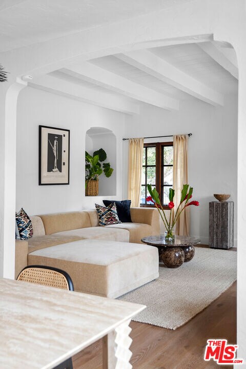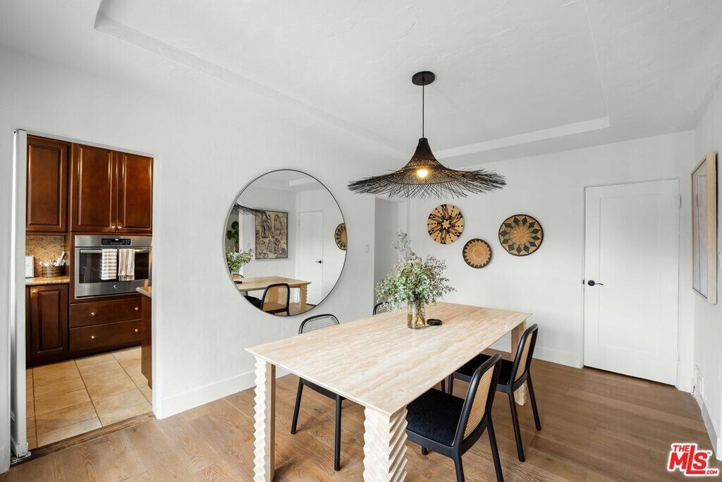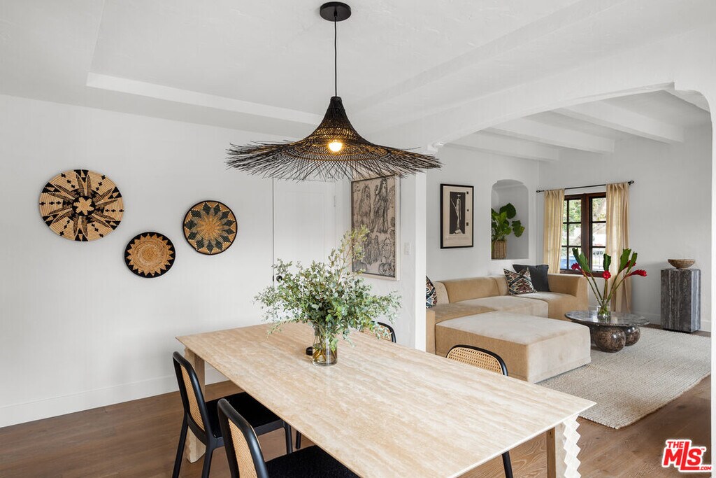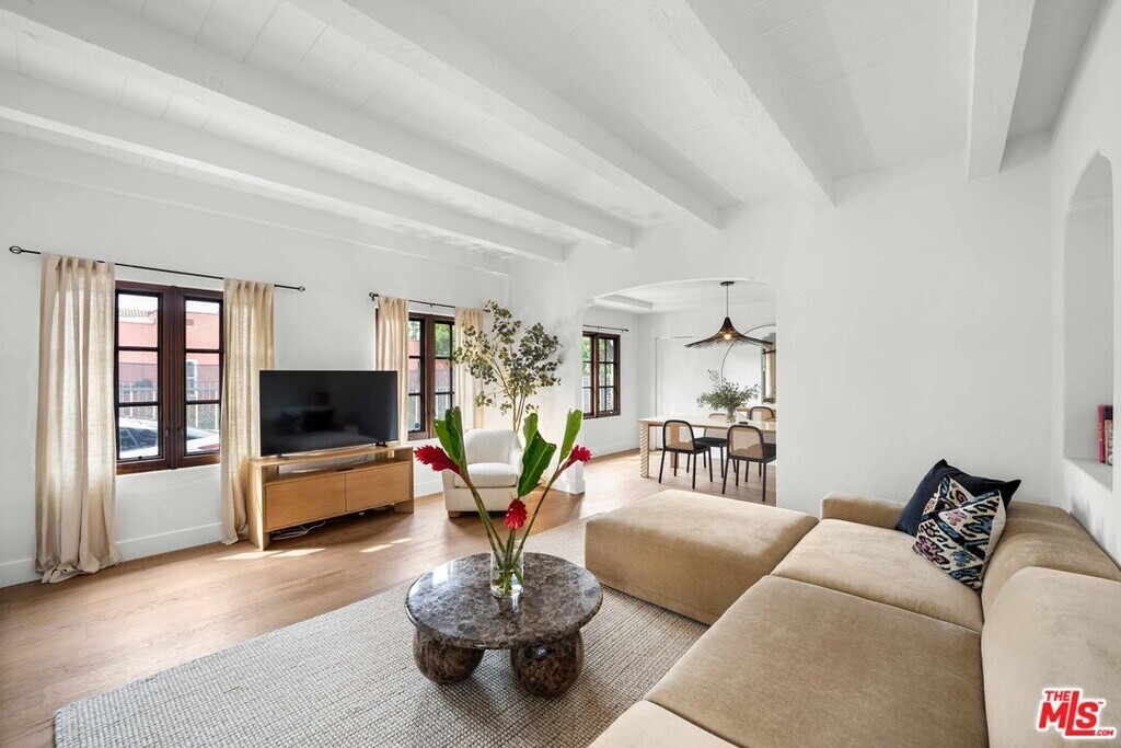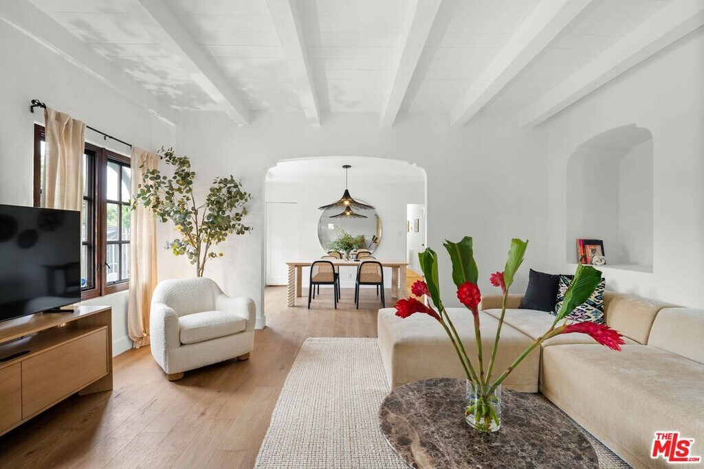 Beautifully updated side-by-side Spanish duplex with expansive grassy park-like yard. Mature landscaping in protected gated front yard. This exquisite, spacious one bedroom home is a gem you do not want to miss. Upon entry you will walk into a sunshine filled, open living room with beamed ceiling, deep windows, top-of-the-line furniture, and tons of natural light. The living room opens to the formal dining room, which opens to the kitchen. No expenses were spared with the furniture and decor in this gorgeous home. Kitchen has stone counters, is equipped with appliances including microwave, fridge/freezer, and dishwasher drawer, and washer and dryer. Laundry room is off the kitchen with a side door to the beautiful backyard. The bedroom features a King bed and state of the art mattress which offers remote controlled massage settings and more. Extra large backyard with hardscape and grassy area, pergola area. One car garage and driveway parking, plus a bonus office space with glass doors to yard. HOME IS *UNFURNISHED* Amazing central location close to The Grove and shops/restaurants on Beverly, Melrose, La Brea etc. MLS# 26662405