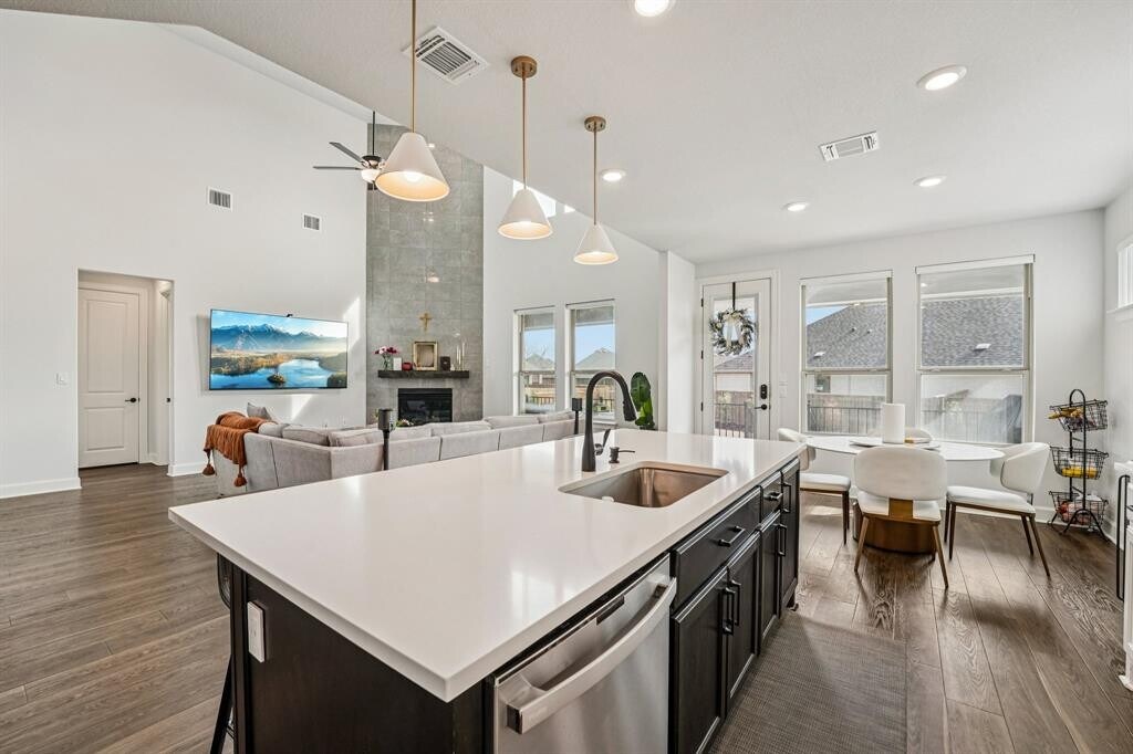 Gorgeous two-story home spanning 3,029 sqft and situated on an over sized corner lot in the 6 Creeks community. Incredible floor plan featuring two bedrooms on the main level plus multiple living and dining spaces. Open concept main living with soaring ceiling and floor to ceiling tiled fireplace focal point. Chef-inspired kitchen with quartz counter tops, under-cabinet lighting, 5-burner gas cooktop, and built-in wall oven/microwave. Refrigerator, washer, dryer and kitchen barstools included with lease! Spacious primary suite on the main level with luxury vinyl plank flooring. Primary bath en-suite with dual vanities, walk-in closet, and beautifully tiled walk-in shower with rain shower head. Dedicated laundry room with cabinet storage and counter space. Upstairs are the remaining 2 bedrooms, a full bath, and a second living area. Step outside to the extended covered patio, ideal for entertaining or relaxing. Expansive backyard with meticulous landscaping and storage shed. Walking distance to the community pool, pickleball courts, playground & fishing pond. Convenient to I-35 & numerous shopping/dining/grocery/entertainment options in Kyle like Evo, HEB & Costco. Award winning Hays ISD schools. Simply a must see! MLS ID 3414474