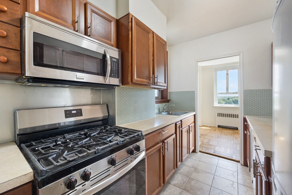 Step into this beautifully sunlit 1-bedroom, 1-bathroom co-op rental unit in the coveted River House, where comfort and style meet. A gracious entry foyer flows into a generous living room, complete with a separate dining area and expansive, wall-to-wall picture windows that bathe the space in natural light. Enjoy breathtaking sunsets and serene, tree-lined western views from your private terrace, accessible through elegant French doors. The open-concept galley kitchen boasts sleek stainless steel appliances, custom cabinetry, modern countertops, a tiled backsplash, and ceramic tile floors. Gorgeous refinished wood floors extend throughout the apartment, adding warmth and charm. The oversized bedroom features two spacious closets, providing ample storage. River House offers a host of amenities, including a 24-hour doorman and a fully-equipped fitness center. The location couldn't be more convenient—just steps from local schools, parks, shops, and restaurants. Commuters will love the quick access to the Riverdale Metro-North station, which provides a direct route to Grand Central. Plus, a convenient shuttle bus service (just a 3-minute ride) to the station is available at the corner, also offering local service to the subway and express service into Manhattan. This is a rental in a coop building w/ board approval and requirements. Lease availablke12 months w/12 month extension.