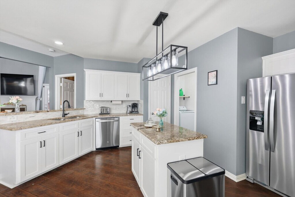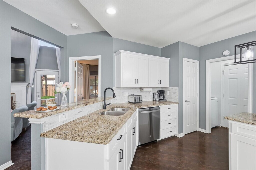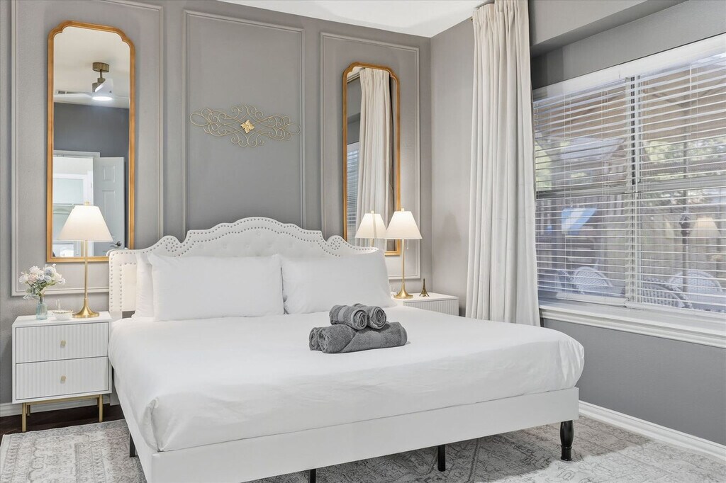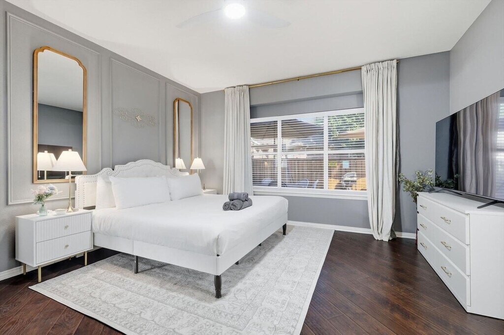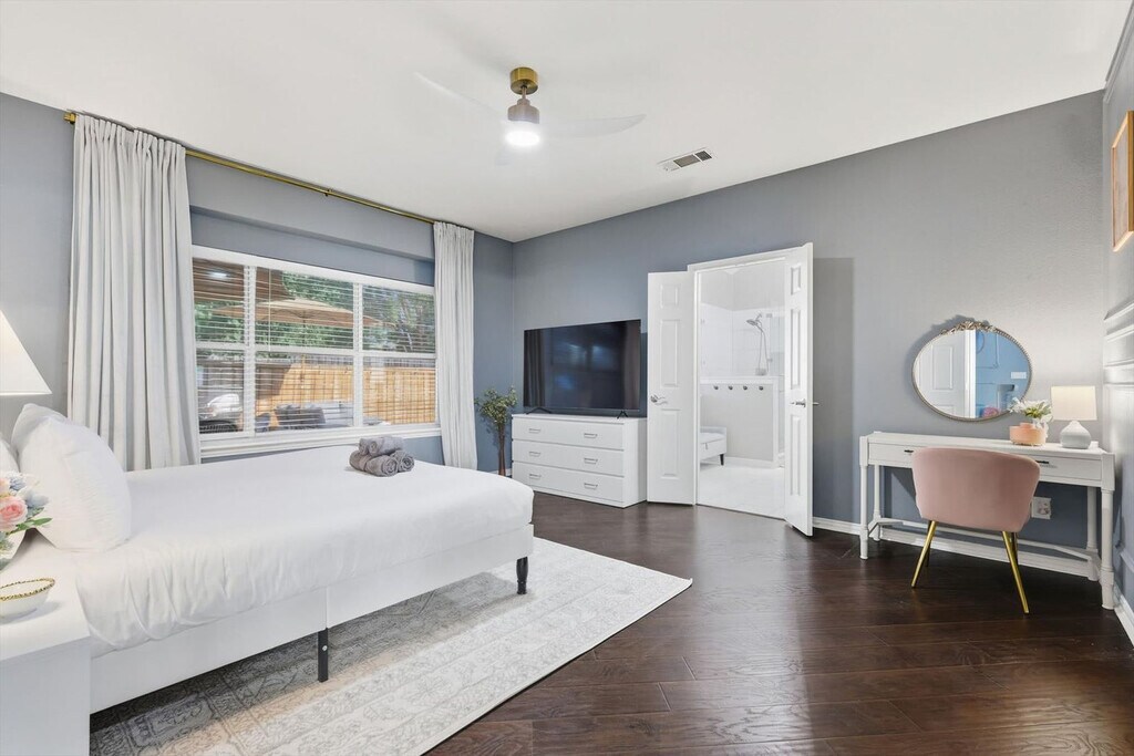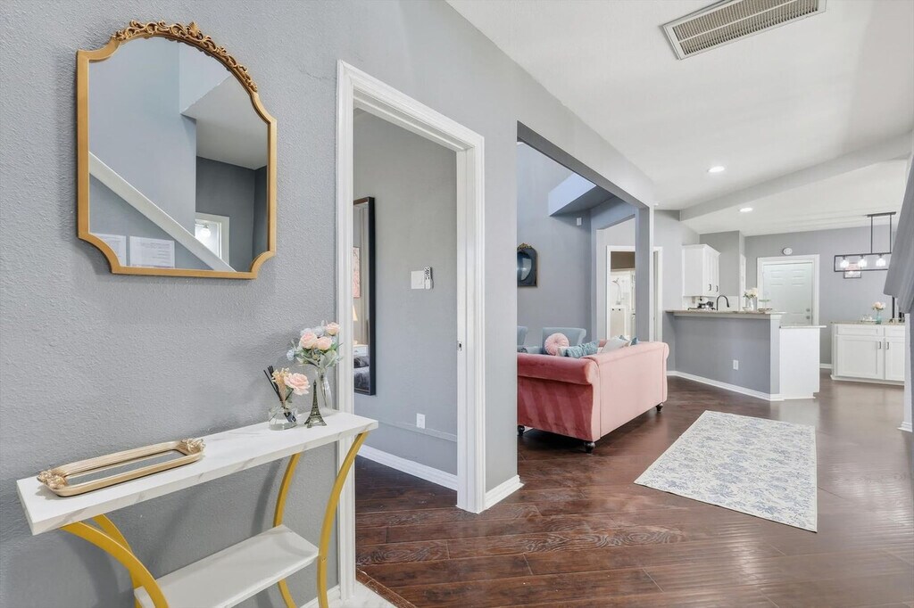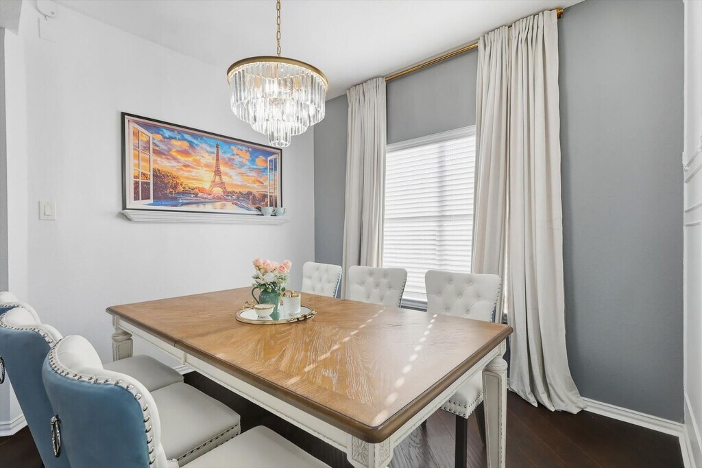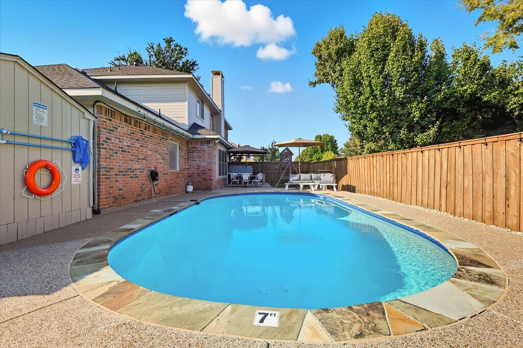 Feel at home in this Parisian-themed Lewisville getaway, perfect for your next trip! This vacation home features 5 bedrooms and 2.5 bathrooms and can easily accommodate large groups of up to 10 guests. Fully equipped for all your cooking needs, this spacious kitchen has plenty of space for you to channel your culinary genius! No need to choose between dinner prep or socializing as guests can get a front-row seat to all the kitchen action from the breakfast nook and can keep the chef company. The living room features sleek Parisian-inspired furniture and tasteful designer accents, where you can sit back, relax, and put your feet up! You won’t want to miss the dinner bell when you can eat in a Parisian-themed dining room that is reminiscent of a stylish Parisian boutique café. Take the fun times outdoors into your very own private backyard getaway with an outdoor swimming pool and hot tub, kid’s playground set, and patio with a BBQ grill. At-home movie nights can be taken to the next level in the cinema room! A laundry room has a washer and dryer available for your use should you wish to refresh your clothing during your stay. Free parking is available to guests in the two-car garage. An additional nightly rate will be applied for more than six guests, at $29 per guest. Lewisville, Texas, is a dynamic suburban community in the thriving North Texas region. Located just minutes from DFW International Airport and straddling two major highways, Lewisville is perfectly positioned for easy access to the rest of North Texas and the world. With safe neighborhoods and family-friendly recreation options, there are many reasons to choose Lewisville as your place to live, work and play! Here are a few highlights to check out while you’re here: Lewisville Lake Park, a 662-acre park located along the Lake Lewisville shoreline with a golf course, marina, day use areas, and athletic facilities [11 min drive], Wayne Ferguson Plaza, a 1.5-acre urban park and community gathering space located in the heart of Old Town Lewisville! [7 min drive], Lewisville Grand Theater, a spacious, contemporary venue featuring theater performances, events & classes, plus an art gallery [7 min drive], and plenty of nearby hiking and biking trails such as the Garden Ridge Trail, Valley Ridge Greenbelt Park Trail, and Railroad Park Trail. For those interested in exploring Dallas, here are some noteworthy attractions: ICR Discovery Center for Science & Earth History, a museum with stunning planetarium shows, state-of-the-art exhibits, and live science presentations! [21 min drive], Mandalay Canal Walk at Las Colinas, a beautiful paved waterfront trail with waterfalls and restaurants; you can even take a gondola ride here! [23 min drive], Cavanaugh Flight Museum, an aviation museum featuring a vast collection of vintage fighter planes [22 min drive], and Sam Houston Trail Park, a greenbelt featuring 22-miles of pathways for walking, biking, and rollerblading alongside the river [18 min drive]. Smoking of any type is not allowed and violations are subject to a $450 fine plus the cost to clean, deodorize, and repair damages. Parties or large unauthorized gatherings of any sort are not allowed. Only registered guests will be allowed on the property. Check-in time is 4pm and check-out time is 10am. Pets should be discussed in advance; only house-trained pets are allowed and must be kept off beds and furniture, and pet cleaning fees will be applied. Registration Number: STR-25-217
