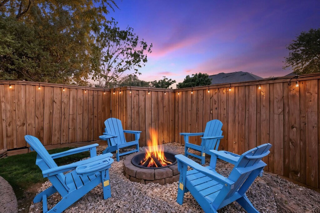 Feel at home in this Parisian-themed Lewisville getaway, fully decked out with indoor and outdoor entertainment options. This vacation home features 5 bedrooms and 2.5 bathrooms, comfortably accommodating large groups of up to 10 guests. This home is fully equipped for short-term and medium-term stays, making it an excellent choice for corporate housing needs. The spacious kitchen has everything you need for cooking, including cooking essentials, appliances, and a kitchen island. Guests can socialize in the breakfast nook with built-in seating. The living area features sleek Parisian-inspired furniture, designer accents, two couches, a chaise lounge chair, coffee tables, a designer rug, a flat-screen TV, and high-speed Wi-Fi. The Parisian-themed dining room includes a dinner table with seating for 6 guests, place settings, and cutlery. The backyard features an outdoor swimming pool, a hot tub, a kid’s playground set, a patio with a BBQ grill, and a fully fenced yard. A laundry room has a washer and dryer available for your use. Take at-home movie nights to the next level in the cinema room. Free parking is available to guests in the two-car garage. House-trained pets are welcome with a non-refundable pet fee of $150 per pet (maximum of 2 pets per stay). With each additional guest beyond the first six, a $29/night fee will be applied. Located just minutes from DFW International Airport and straddling two major highways, Lewisville is perfectly positioned for easy access to the rest of North Texas and the world. Nearby attractions include Lewisville Lake Park, Wayne Ferguson Plaza, and Lewisville Grand Theater. For those interested in exploring Dallas, noteworthy attractions include the ICR Discovery Center for Science & Earth History, Mandalay Canal Walk at Las Colinas, Cavanaugh Flight Museum, and AT&T Stadium. Parties or large unauthorized gatherings of any sort are not allowed. Smoking of any type is not allowed, and violations are subject to a $450 fine plus the cost to clean, deodorize, and repair damages. Registration Number: STR-25-217 [SI]