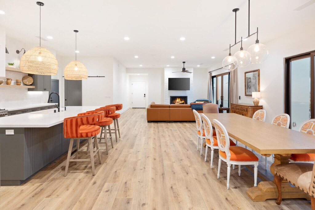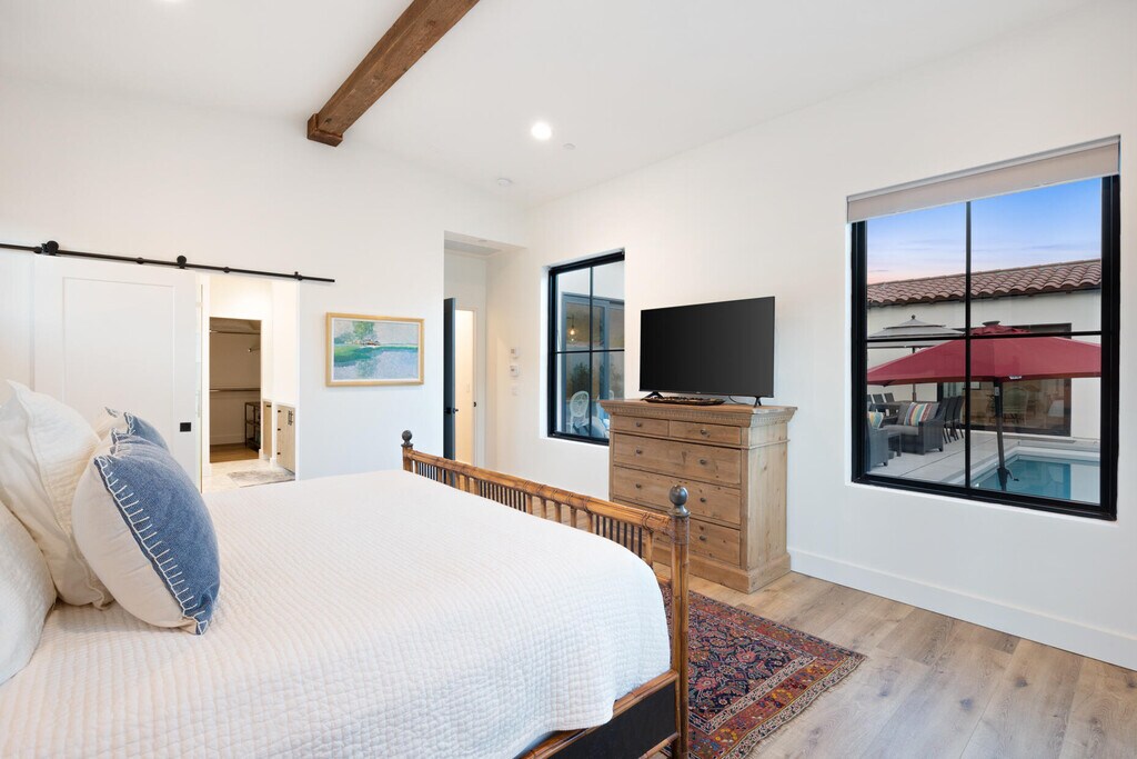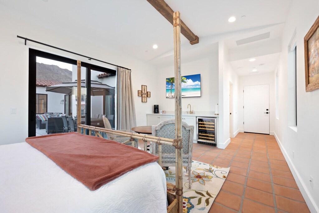 Make your desert stay memorable in this exquisite newer modern hacienda construction on a corner lot high in the Cove. Completed in Oct 2022,this 2798 SqFt home offers 4 bedrooms,4 1/2 baths,an open concept great room and gourmet kitchen,a laundry room with storage,and a powder room/mud room. The outdoor living space is perfect for entertaining with an outdoor shower,gas BBQ,outdoor fireplace with TV,and a salt water pebble tec pool and spa with LED mood lighting. Two of the bedrooms have king-size beds and one has a queen bed. All bedrooms are en suite,and the primary bathroom features a relaxing soaking tub. The Great Room,designer kitchen and dining room all have high ceilings,surround sound and a large dining table that can seat up to 10 people. The attached Casita,which opens up to the pool,has its own entrance and features 450 SqFt of living space with a king-size bed,a sitting area,a kitchenette with beverage fridge,sink,and coffee maker. On Demand water heater,filtration water system on all faucets,surround sound,Eero Mesh Wi-fi,Ring camera,automatic security lighting,landscape lighting,and a privacy wall around the entire perimeter of the property are some of the outstanding features this home offers. Note: The private entry courtyard with seating was completed after the pictures were taken. Bi-weekly house cleaning,pool cleaning and landscaping included. MLS # 219145388