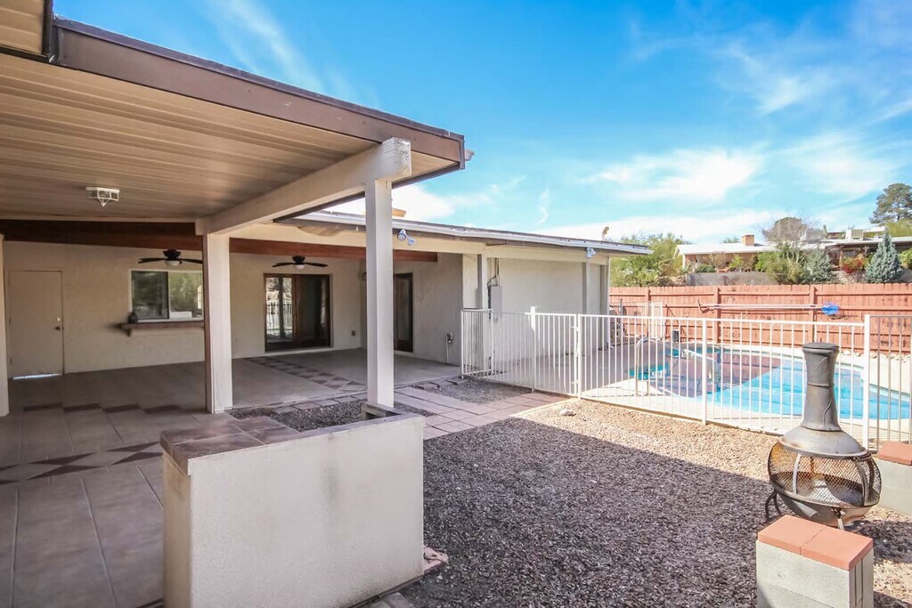 Two living areas. 3bedroom 2 bath and Studio with kitchenette Two separate living areas joined by covered patio with pool This large living area two home unit is perfect for two family living Entertain poolside with room to spare