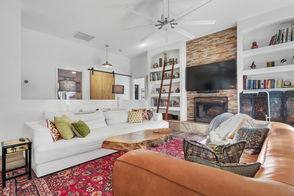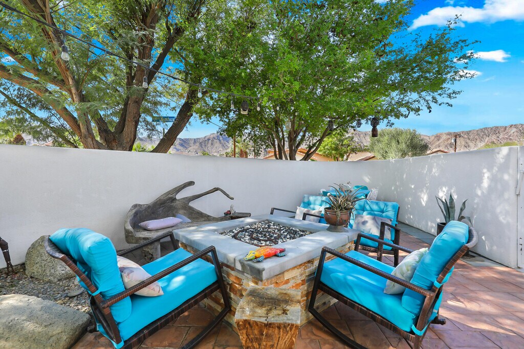Welcome to The La Quinta Cove- A charming retreat nestled against the stunning Santa Rosa Mountains and surrounded by miles of scenic hiking and biking trails.This Santa Fe-style home offers a serene desert escape with a shady wraparound patio,complete with cozy seating,an outdoor dining area,and a fire feature perfect for cool desert evenings under the glow of beautiful overhead lighting. This home is also appointed with oil paintings,an art library,guitar,and a Sonos System. Spend sunny days lounging by the private pool while soaking in the mountain views. Step through the glass front door into an inviting living space featuring a fireplace,comfortable seating on two plush couches,and French doors that open to the patio. The fully equipped kitchen has everything you need for home-cooked meals,while the spacious primary bedroom offers an ensuite bath for your comfort. Two additional guest rooms provide plenty of space for family and friends. Located just minutes from Old Town La Quinta,you'll have easy access to local shops,restaurants,and entertainment. Pickleball courts are nearby,and SilverRock Golf Course is just a short seven-minute drive away. Come experience desert living at its finest in this artistic,welcoming home where comfort,charm,and adventure meet.