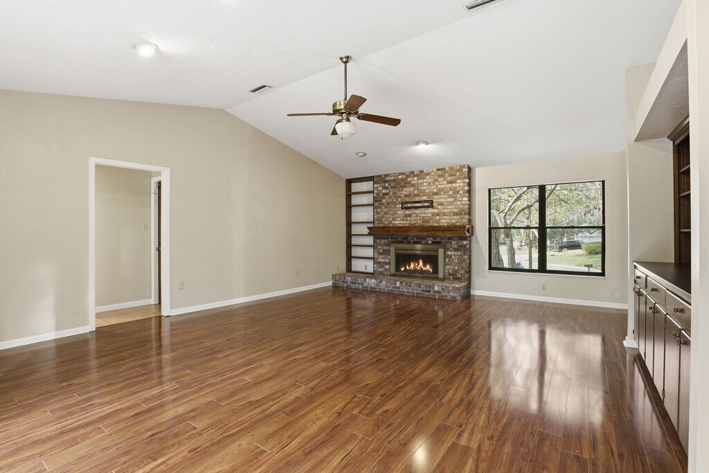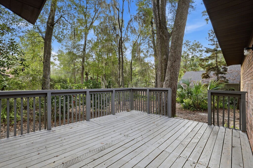Charming and spacious, well-maintained three-bedroom two bath residence with new interior paint in Haile Plantation. This home sits on a large lot at the end of a quiet cul-de-sac and is loaded with potential. It features beautiful wood laminate and tile flooring, vaulted ceilings, a cozy gas fireplace in the living room with lots of built in cabinets, and a convenient study/ smaller 4th bedroom. The eat-in kitchen features wood cabinets, electric range with dual oven, built-in microwave, dishwasher, French door refrigerator, and pantry- all the necessities to whip up your next meal. Inside washer and dryer (not warranted). Sliding glass doors from the kitchen and living room lead to a large, tree shaded deck. New concrete driveway and walkway to the front door. Savor a stroll down the road as you walk to dinner in the award-winning Haile Village Center or Saturdays to the farmer's market. This home has an extraordinary location with great schools, walking distance to Hawkstone Golf and Country Club and an easy commute to UF, Shands and the VA. Celebration Pointe and Butler Plaza are about 5 miles away. Lawn care included. Interior and exterior pest control included. The home is animal friendly allowing for dogs and cats. There is a $250 non-refundable animal fee per animal. To schedule a tour please call Union Properties at or visit our website at
