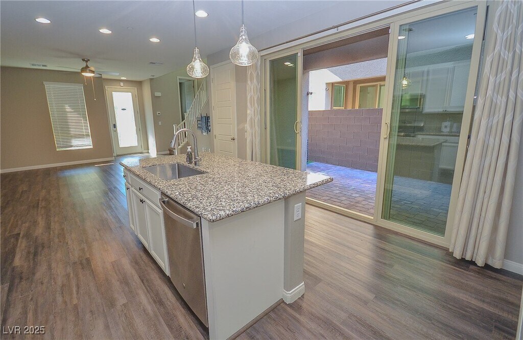 See this 3 bedroom, 2.5 bath, over 1500 sq ft home, located in the sought-after Redpoint Square neighborhood of Summerlin. Moro Rock offers picturesque mountain views, beautiful parks, and private paved trails for your enjoyment. Enjoy contemporary living in this stunning home with stylish upgrades, including fresh interior paint, elegant 42†upgraded kitchen cabinetry, custom closets upstairs, stainless steel appliances, and luxury vinyl plank flooring throughout first floor. The main level showcases expansive 10-foot sliding glass doors that fill the open-concept living area with natural light. Step outside to your own serene side yard retreat, thoughtfully landscaped with pavers and a covered patio, ideal for entertaining or unwinding! Move-in ready! See this today!