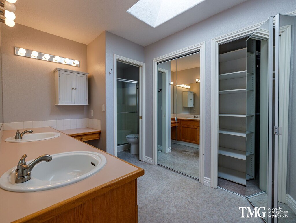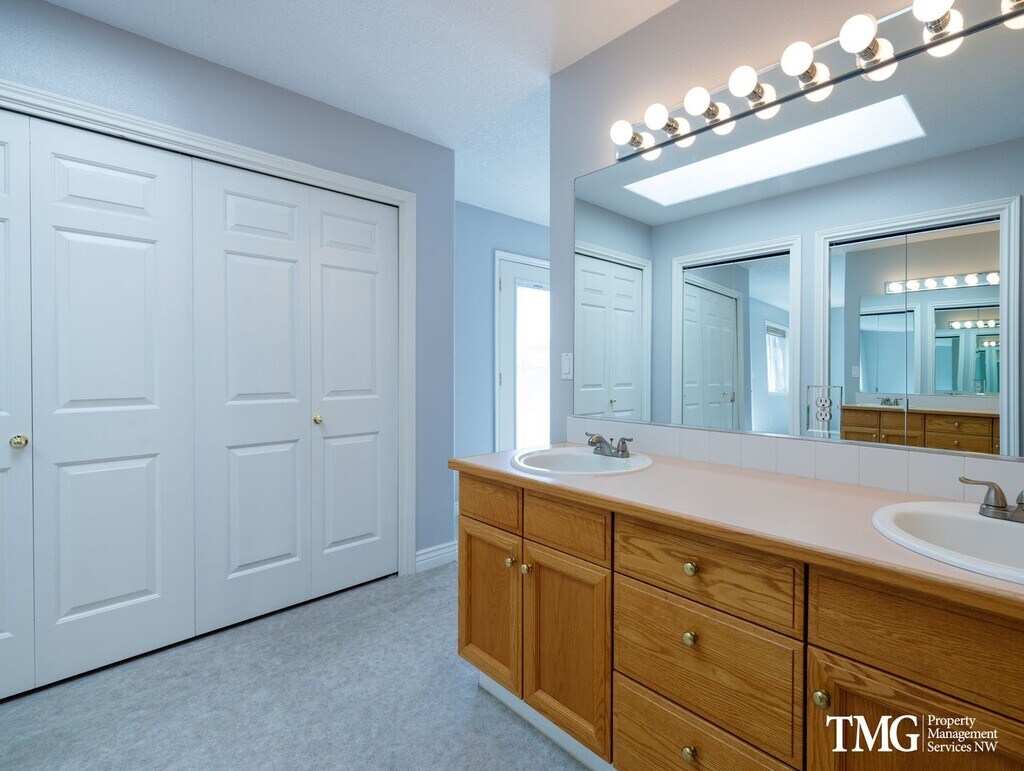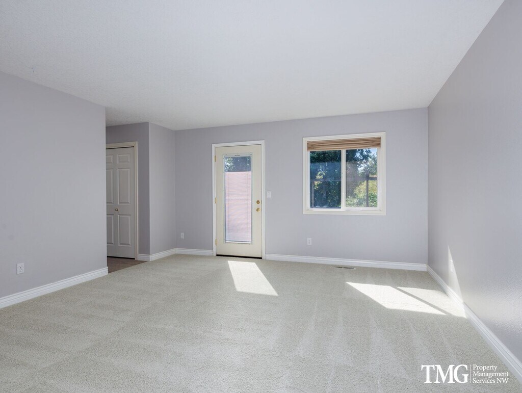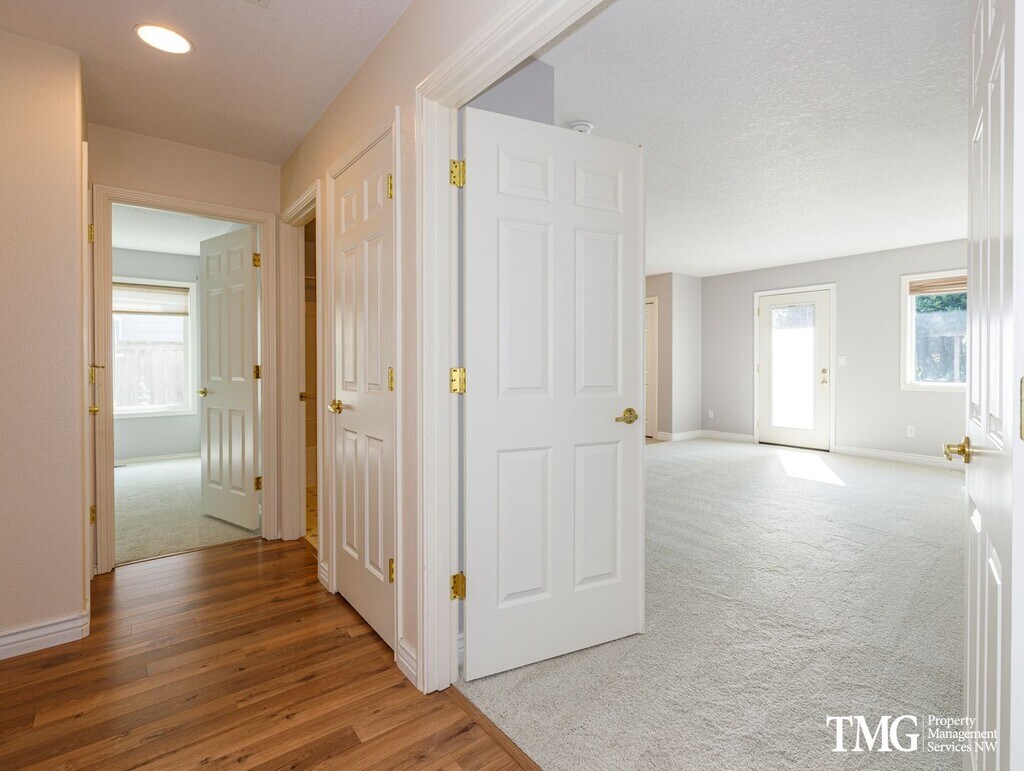 Located just south of Lake Road, this home sits alongside a beautiful greenbelt, offering exceptional privacy and a serene backdrop. You’ll be just minutes from Lacamas Lake, Camas Meadows Golf Club, and The Hammond Kitchen & Craft Bar, with quick access to HWY-14 and I-205 for an easy commute. Step inside to a bright, open layout that’s perfect for both everyday living and entertaining. The formal living and dining rooms welcome you at the front, while the family room, dining nook, and kitchen flow seamlessly toward the backyard. Natural light fills every corner, and the dining nook opens to a deck ideal for relaxing on those classic PNW evenings. The first main bedroom features built-in storage, creating a convenient workspace while leaving plenty of room for furniture. Down the hall, past the laundry area, is a second bedroom with generous closet space. The shared bathroom offers a tub/shower combo and ample vanity storage. Double doors lead to the expansive primary suite, featuring space for a cozy sitting area, a generous closet, and a private primary bathroom with dual vanities and a modern shower enclosure—your own retreat within the home. Your next home is waiting—act now to make it yours! *Please note: photos may not accurately reflect the layout or finishes for this unit. Actual finishes and/or features may vary. Owner/agent assumes no responsibility for discrepancies between pictures and final product. Please conduct a self-tour to view the property.