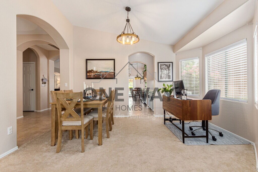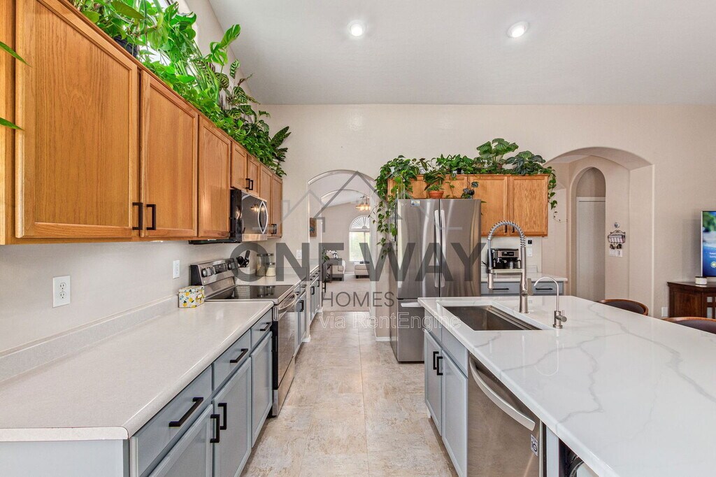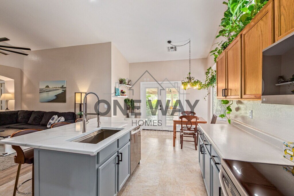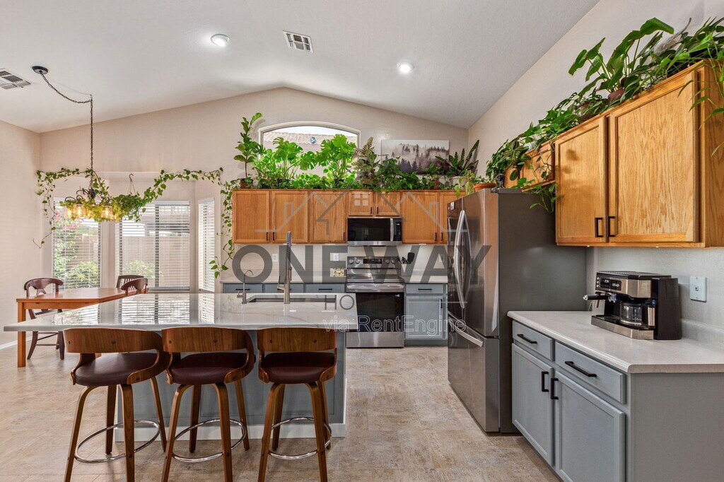 Available for rent—this spacious and thoughtfully upgraded 3-bedroom, 2-bathroom home offers comfort, style, and unbeatable outdoor living. Inside, you'll find two generous living areas perfect for entertaining or relaxing. The open kitchen is a chef's dream, featuring all-new stainless steel appliances (2023), a large island with seating, and roll-out shelves in all lower cabinets. A charming butler's pantry/coffee bar provides added storage and convenience between the kitchen and the formal living/dining room. The home features stylish wood-look laminate flooring in the main living areas and an updated hall bathroom with a new vanity, mirror, and lighting. The indoor laundry room includes a reverse osmosis (RO) system for added convenience. Step outside to an extended covered patio equipped with built-in misters, perfect for enjoying Arizona evenings. The lush, irrigated backyard includes garden boxes filled with organic herbs—ideal for those who love to cook or garden. With no rear neighbors and a view fence that opens to a greenbelt and stunning mountain views, this backyard feels like your own private retreat. The 2-car garage offers ample storage with built-in cabinets along one wall, upper cabinets on the back wall, and space for a workbench. This home is also ideally located—within walking distance to Skyline Park and just minutes from both the Loop 202 and US-60 freeways, offering easy access to shopping, dining, and more. By submitting your information on this page you consent to being contacted by the Property Manager and RentEngine via SMS, phone, or email.