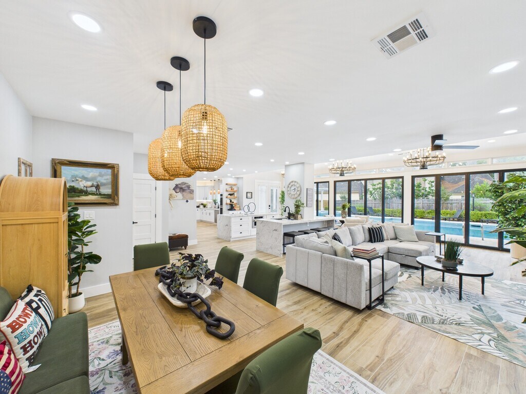 Meticulously updated 7 bed,7.5 bath home,light-filled living areas and a modern open layout. High ceilings & oversized windows flood the interior with natural light,accentuating the neutral design palette & warm wood-tone floors throughout. The gourmet kitchen features marble counters,wall ovens,pot filler,& breakfast bar —perfectly integrated with the adjacent dining zone with dual islands,for casual entertaining. Expansive primary suite is generously spaced w/fireplace,& offers a luxe en-suite bath with dual vanities,dual head shower,dual water closets,soaking tub & huge walk-in closet. Outside,a private backyard oasis awaits with a lavish pool & spa and covered kitchen/patio area offering shade and tranquility. A guest pool house w/ full kitchen & living area. First floor full bathroom and a two-person sauna. The second floor bedroom and full bath provides a private retreat. This oasis retreat sleeps 20 comfortably! Fully furnished! MLS# 80438133
