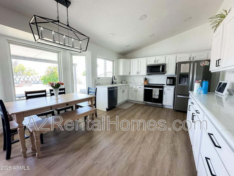 Renovated Mesa 3/2/2 on an almost 1/4 acre lot! Beautiful LVP flooring, white cabinets, quartz countertops, pebble-tec fenced pool, and much more! Located at Higley & Southern this property offers great convenience for commuting, dining, and entertainment! Vaulted ceilings in the living room/kitchen and master bedroom. This lot is massive with a wonderful pebble Tec pool that is fenced in. There is a large grass area, planter beds, and an outdoor shower. It is rare for a rental on a lot this size, with a pool, and in this great location to become available. All appliances including a washer and dryer are included.