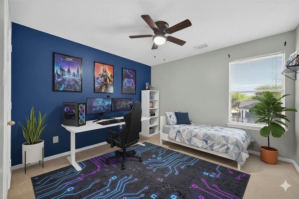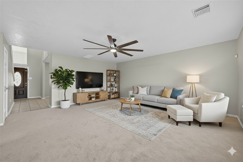 This beautiful corner-lot home is surrounded by mature trees,offering shade and curb appeal. Step inside to a spacious formal dining room that can easily double as a formal living space. The main living area impresses with its open feel and an oversized 8-blade commercial-style ceiling fan. The kitchen is both stylish and functional,featuring stainless steel appliances,a built-in microwave,and a Samsung refrigerator. A full-size washer and dryer are also included for your convenience. Out back,you’ll love the oversized covered patio with two ceiling fans—perfect for outdoor entertaining. Add a few plants,a grill,and a patio set to create your own private backyard oasis! Upstairs,the primary suite is truly a retreat. With vaulted ceilings,another oversized ceiling fan,a garden tub and shower combo,and a walk-in closet fit for a king,you’ll have all the space and comfort you could ask for. You have to see this home in person—schedule your showing today! MLS# 35375540
