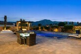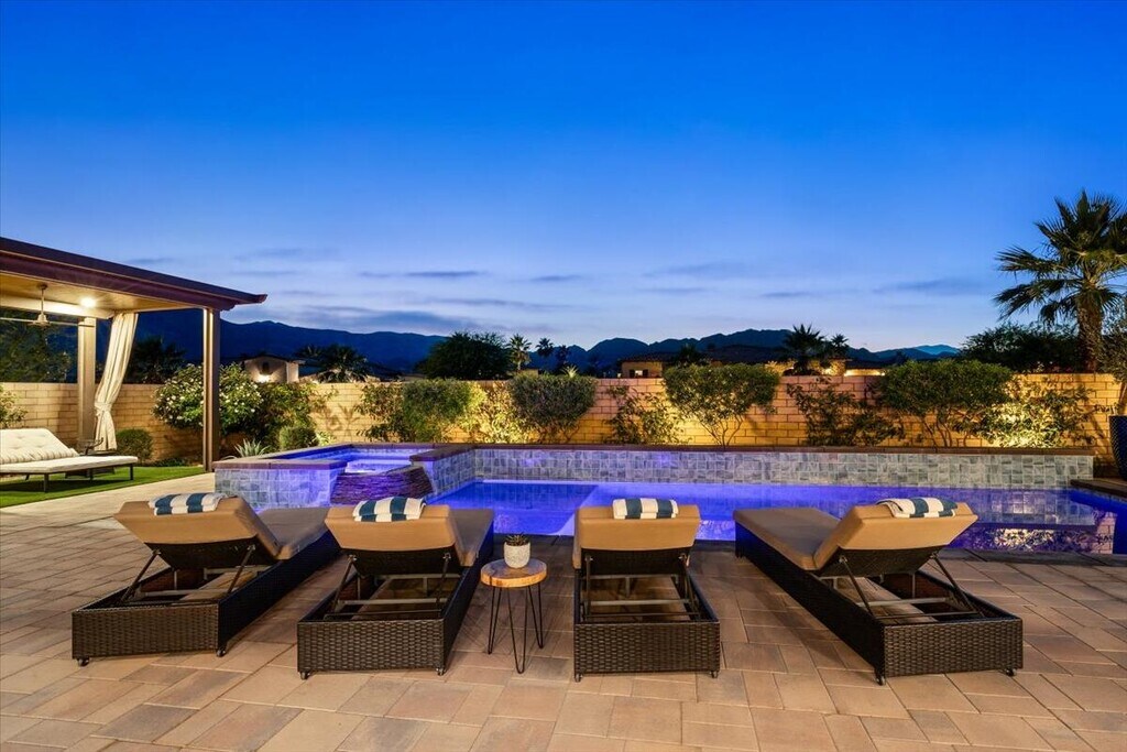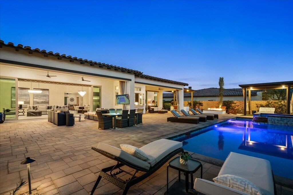 A rare opportunity to experience an exceptionally luxurious property nestled within the gated community of Griffin Ranch. This exquisite well appointed 4-bedroom,5-bathroom cornerstone of tranquility is fiercely intentional about your privacy and comfort. Located on a cul-de-sac,this property offers sweeping mountain views,attractive landscaping,and a resort-like outdoor area. The backyard is a true retreat featuring a custom pool and spa,multiple seating areas,built - in BBQ,firepit and spacious loggia with pergola shade. Large slide away glass doors seamlessly connect the outdoor entertaining area with the indoor living spaces,creating the perfect setting for enjoying the desert lifestyle. Inside,the open concept floorplan is filled with natural light and thoughtful design. The gourmet chef's kitchen is complete with Thermador appliances,a large center island with bar seating,and an additional prep kitchen complete with a second sink,dishwasher,and refrigerator - ideal for hosting gatherings! This gorgeous retreat offers 4 spacious bedrooms and 5 bathrooms,including 2 luxurious primary suites with walk in closets and spa inspired bathrooms. A versatile bonus room provides additional space for a media room,office,or guest lounge and opens directly to a private patio. With approximately 4,154 sq ft of living space,this beautifully appointed home combines elegance,comfort,and functionality in one of La Quintas most sought after communities. Enjoy the amenities Griffin Ranch has to offer including a 10,000 sq ft clubhouse,state of the art fitness center,Pilates/yoga studio,billiards room,jr Olympic size pool and spa,tennis and pickleball courts,bocce ball and much more! Now booking Nov - March 2027. Please inquire for pricing! MLS # 219144821