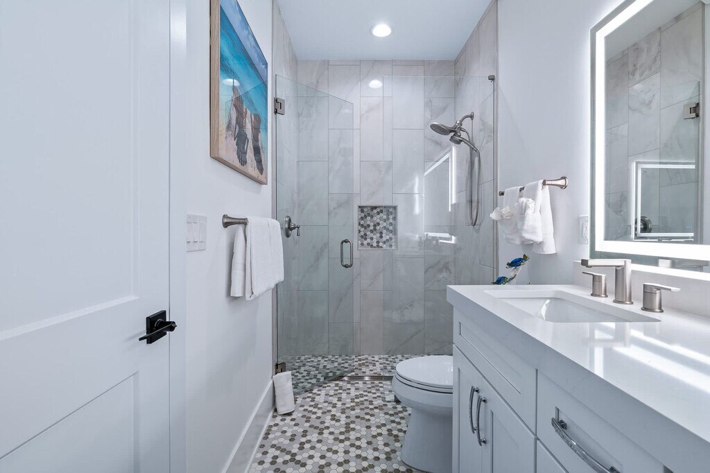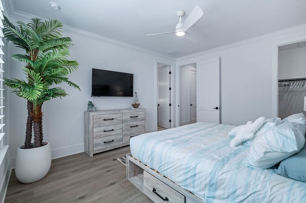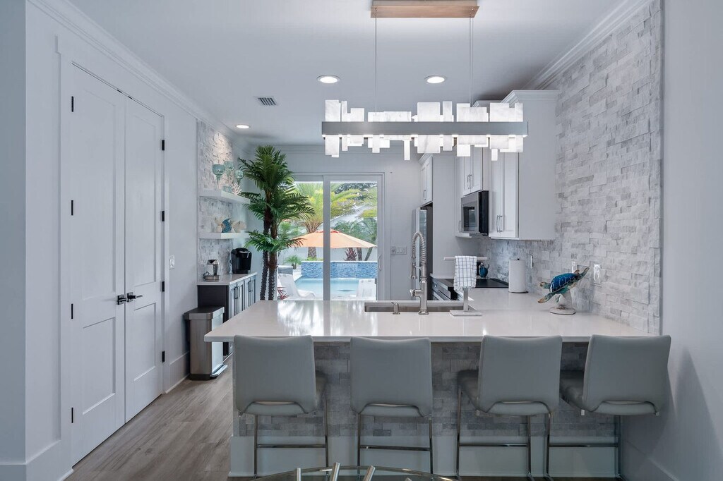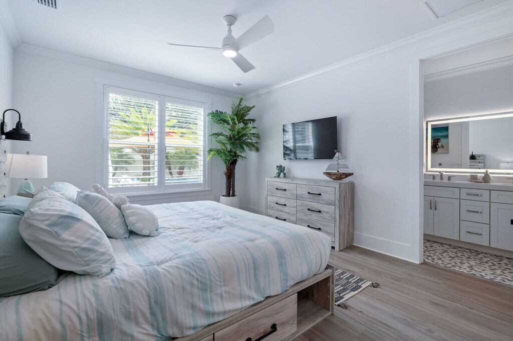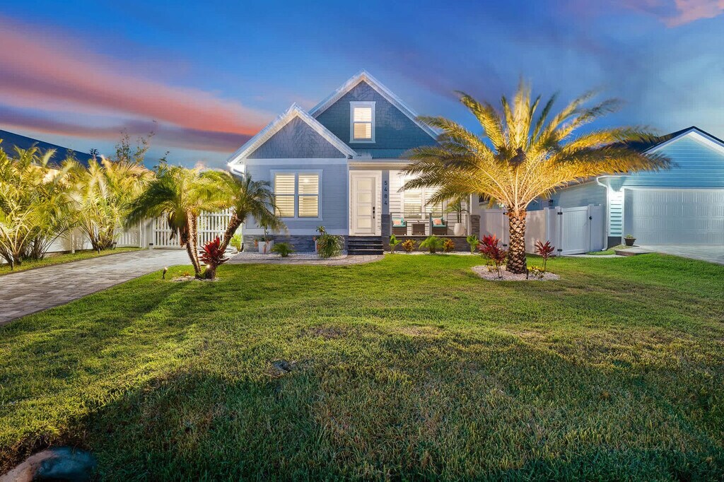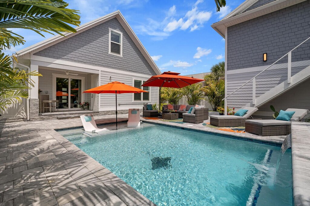 Your beach escape awaits at this stunning St. Augustine home, offering a perfect blend of comfort and convenience. Located less than a 10-minute walk to the beach with public access directly across A1A, this property includes a full home and a garage apartment suite. Enjoy the beautiful outdoor area featuring a heated pool, relaxing loungers, and a shaded sitting area. With a large driveway accommodating boats and vehicles, this home is ideal for those seeking a coastal retreat. Step into your chic St. Augustine oasis, where the spacious living room with a cozy sectional, large smart TV, and electric fireplace welcomes you. The fully equipped kitchen is perfect for preparing in-home meals. The master ensuite boasts a king-size bed, a full bathroom with a walk-in shower, and a large walk-in closet. Additional bedrooms feature queen beds and a full bed with a twin trundle, all equipped with smart TVs. The guest suite offers a fully stocked kitchen, dining set for four, and a queen bed, ensuring comfort for all guests. Guests can bring one dog under 50 lbs for a non-refundable pet fee of $100. The dog must be up to date on vaccinations, have flea treatment, and be potty trained. Additional charges will apply if dog feces is not picked up and properly disposed of, with a fee of $50 per pile. This property is ideally situated with beach access less than a 10-minute walk away and the Palmetto boat ramp just a few blocks away, providing access to the Matanzas River. Historic downtown St. Augustine is a mere 15-minute drive, offering a wealth of attractions and dining options for you to explore. Quiet hours are enforced from 10pm to 8am per St. Johns County ordinance. The primary guest must be present for the duration of the stay, and any guests outside of the reservation must vacate the property during quiet hours. The home is equipped with three active security cameras around the exterior. No smoking or vaping is allowed on the property, and evidence of smoking will result in an additional cleaning fee. Late check-outs and early check-ins require prior approval, with a fee of $50 per hour for late check-outs. Pets are allowed with restrictions and additional fees. The garage is not available for guest use. [SI]