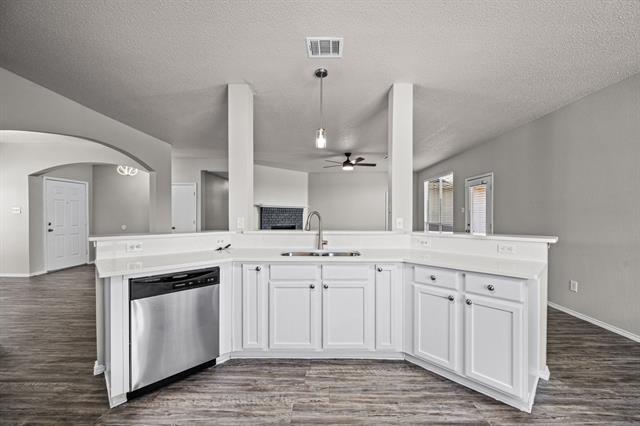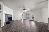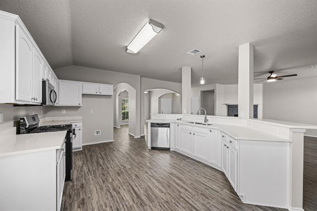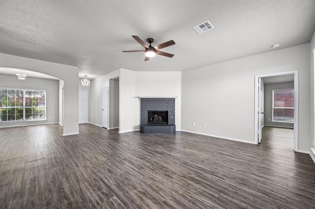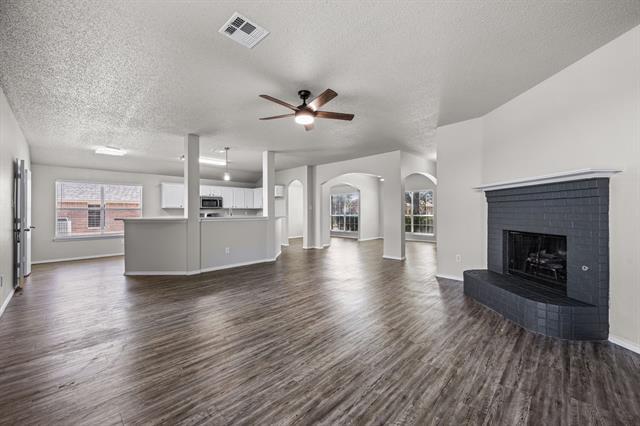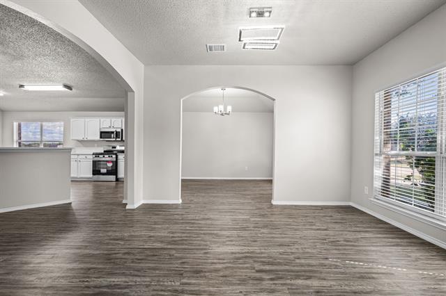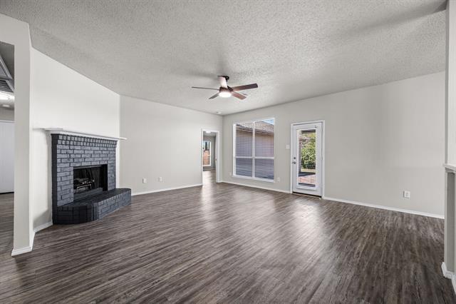 Welcome to 549 Seminole Trail, a beautifully refreshed single-story home perfectly situated in the heart of Murphy. This spacious 4-bedroom, 2-bath residence offers a bright, open layout designed for modern living and effortless entertaining. Step inside to discover fresh designer paint, updated light fixtures, and luxury vinyl plank flooring that flows throughout the home. The expansive living room features a chic painted brick fireplace, creating a cozy focal point that connects seamlessly to the kitchen and dining areas. The light and airy kitchen boasts crisp white cabinetry, stainless steel appliances, and generous counter space — ideal for meal prep or hosting family gatherings. Multiple arched openings and large picture windows fill the home with natural light, highlighting the clean, contemporary feel. The primary suite is tucked away for privacy and offers a spacious walk-in closet and a fully updated bath featuring dual vanities, quartz counters, a soaking tub, and a stunning frameless glass shower with marble-style tile. Three additional bedrooms provide flexible space for guests, a home office, or playroom. Enjoy outdoor living in the private backyard with an extended patio — perfect for grilling, entertaining, or relaxing under the Texas sky. Mature trees frame the inviting curb appeal, and the detached garage offers extra storage or workshop potential. Located in a quiet, established neighborhood just minutes from top-rated schools, parks, and shopping, this move-in ready gem blends classic charm with modern updates — the perfect place to call home in Murphy!