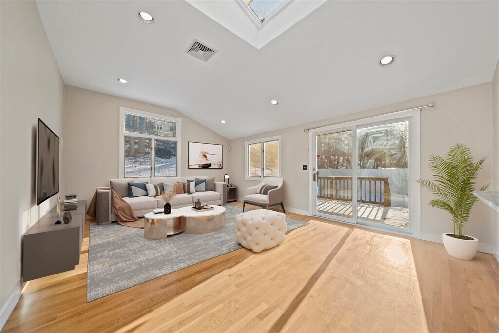 Bright and inviting single-level living awaits in desirable Needham Heights! This well-maintained 3-bedroom,2-bathroom Ranch sits on a level lot in a quiet,tree-lined setting. Enter to a spacious front-to-back living/dining room bathed in natural light,with gleaming hardwood floors throughout. The eat-in kitchen features gas cooking and flows seamlessly to a sunny family room with vaulted ceiling and skylight—ideal for gatherings—plus a slider to a private deck and fully fenced backyard. The primary suite offers three double closets and private bath; two more bedrooms share a full bath. Comforts include central air,gas heat,and recessed lighting. Less than 1 mile to Needham Heights Commuter Rail,with easy highway access and nearby shops,groceries,cafes,and restaurants. Move-in ready—perfect for commuters and families. Schedule your showing today! MLS# 73472706