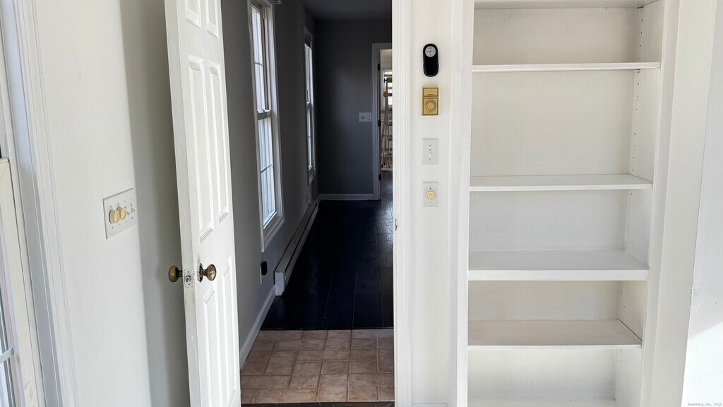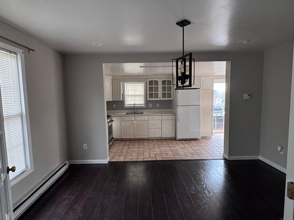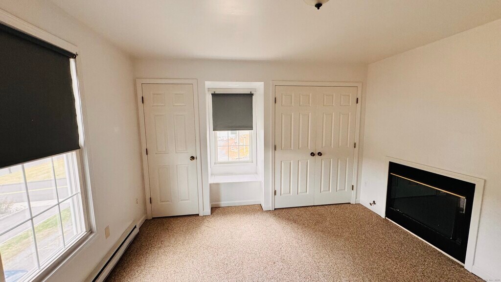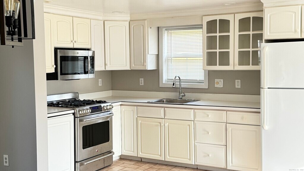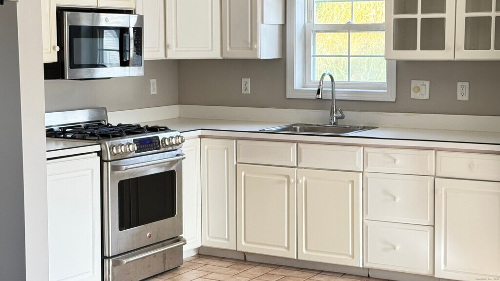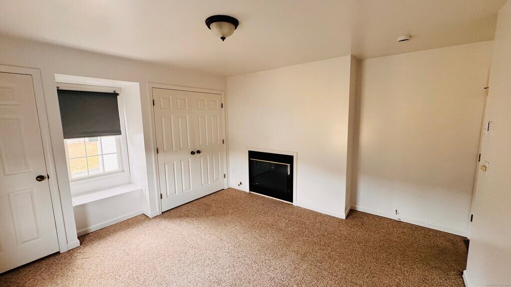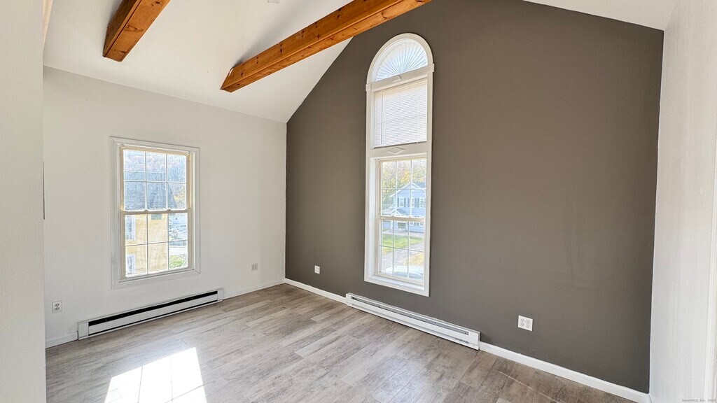 Call for Availability - This refreshed second-floor 2-bedroom apartment offers bright, comfortable living spaces with standout architectural details and outdoor areas on a .51-acre flat lot. The home features LVT wood-look flooring in most rooms, carpet in the second bedroom, fresh interior paint, newer fixtures, and abundant natural light. The inviting living room includes a decorative fireplace and French doors opening to the dining room. The rear eat-in kitchen features white cabinetry, good counter space, a gas stove, overhead microwave, and a window above the sink. Off the kitchen is the in-unit laundry area with a new washer and dryer, along with a bay window offering natural light and pleasant views of Naugatuck. The kitchen also provides access to a balcony with a spiral staircase. The primary bedroom offers vaulted ceilings, exposed beams, an arched feature window, built-in shelving, and excellent light. The second bedroom includes carpeted flooring, good closet storage, and the reverse side of the decorative fireplace. The bathroom has been refreshed with updated fixtures and a newer sink. Additional features include electric heat, a private interior entry accessed through the newly tiled shared front porch, and off-street parking. Multiple windows provide elevated views, enhancing the bright second-floor setting. Conveniently located near shopping, parks, everyday necessities, and public transportation. MLS# 24141050