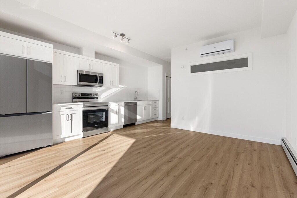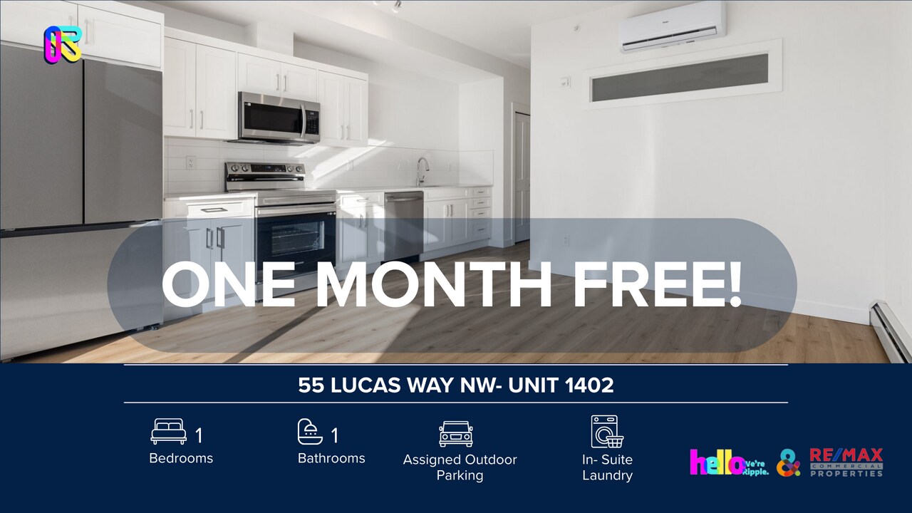 AMAZING 1 BED, 1 BATH CONDO | NO PETS ALLOWED Welcome to your next home! This beautifully maintained 55 Lucas Way NW - Unit 1402 offers the perfect blend of comfort, style, and convenience. Situated in the community of Livingston, Located just a short walk from the building, this massive recreation center is the social and active heart of the community, offering a level of amenity access rarely found in standard condo developments, this unit is ideal for anyone looking for a clean, modern, move-in ready space. SHOWINGS: Open-house format — book today! Prices, availability, and promotions subject to change without notice. Features: - Furnished or Unfurnished: Unfurnished - Utilities Included: Natural Gas & Water - Pets: No Pets Allowed - Smoking: Non-Smoking - Parking: Assigned Outdoor - Storage Included: Yes - Laundry: In- Suite Laundry - Management Type: Full Management - Lease Term: Long Term Why You'll Love It: - Architectural Airiness: The living area boasts soaring high ceilings and expansive oversized windows, flooding the entire space with an abundance of natural light. - Gourmet Chef's Kitchen: An open-concept culinary space featuring sleek stainless steel appliances, a convenient walk-in pantry for extra storage, and a double undermount sink. - Social Centerpiece: A large flush kitchen island provides the perfect spot for casual dining, morning coffee, or entertaining guests. - Dedicated Dining Space: A versatile dining area situated perfectly between the kitchen and living room, ideal for formal dinners or a home office setup. - Serene Primary Suite: The spacious bedroom serves as a private retreat, complete with large windows that maintain the home's bright and open feel. - Ultimate Convenience: Enjoy the ease of in-suite laundry and a thoughtfully designed layout that maximizes every square foot of living space. - Outdoor Living: Step out onto your private balcony (featuring a gas line) to enjoy the fresh air and community views.? Location Perks: - Steps from "The Hub": Exclusive access to Livingston's 35,000 sq. ft. HOA facility, featuring a gymnasium, splash park, tennis courts, and three skating rinks. - Livingston West Ponds: Situated directly alongside beautiful environmental reserve ponds with fountains and a scenic pathway system for walking or jogging. - Retail Convenience: Only a 2-minute drive to Carrington Plaza, featuring No Frills grocery, Shell, McDonald's, and various local dining options. - Commuter's Dream: Immediate access to Stoney Trail and Deerfoot Trail, placing you only 15 minutes from the Calgary International Airport and 20 minutes from Downtown. - Outdoor Adventure: Surrounded by 250 acres of open space, including 17 nearby playgrounds, a pump track, and a dedicated off-leash dog park. - Future Growth: Located near the future terminus of the LRT Green Line, ensuring long-term connectivity and potential value appreciation. - Quiet Urban Retreat: Positioned in a quieter low-rise complex that balances urban vibrancy with the peace of a nature-adjacent setting. Book your viewing today — this one won't last.