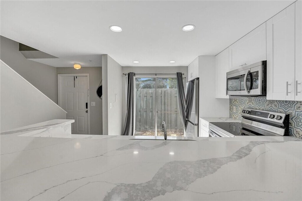 AVAILABLE MAY 1,2025. This 2bedroom/1.5 bathroom townhome has been completely remodeled. Kitchen features quartz counter,bar top seating,stylish backsplash and newer stainless appliances. Screened in patio in the back to enjoy some fresh air. Tile flooring throughout. Two bedrooms upstairs,one has a walk-in closet. Bathrooms feature,new vanities,LED mirrors,tub/shower. Washer & dryer upstairs. Large storage under the stairs. Lovely neighborhood. This unit is located extremely close to the pool. Great location in Pompano Beach,Publix is right across the street how convenient. 3 Miles to the beach,new pier and restaurants. Two parking spots. Pet friendly. Water/Trash Included. Quick approval. Don't miss out! MLS ID B26021026