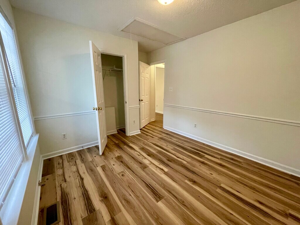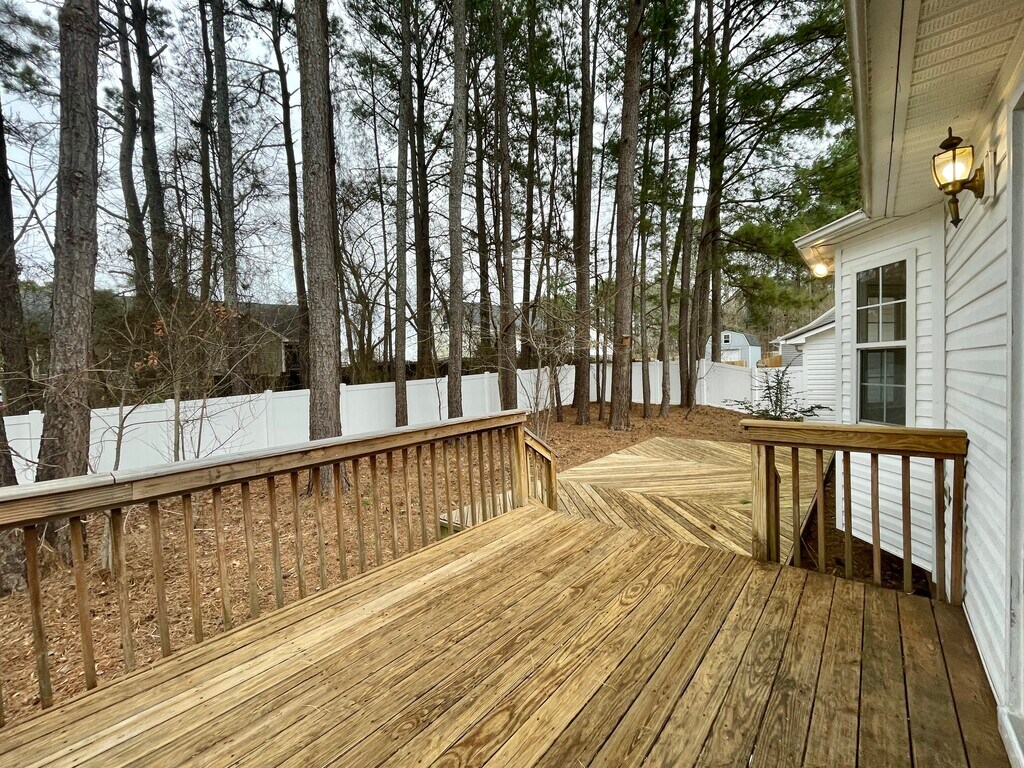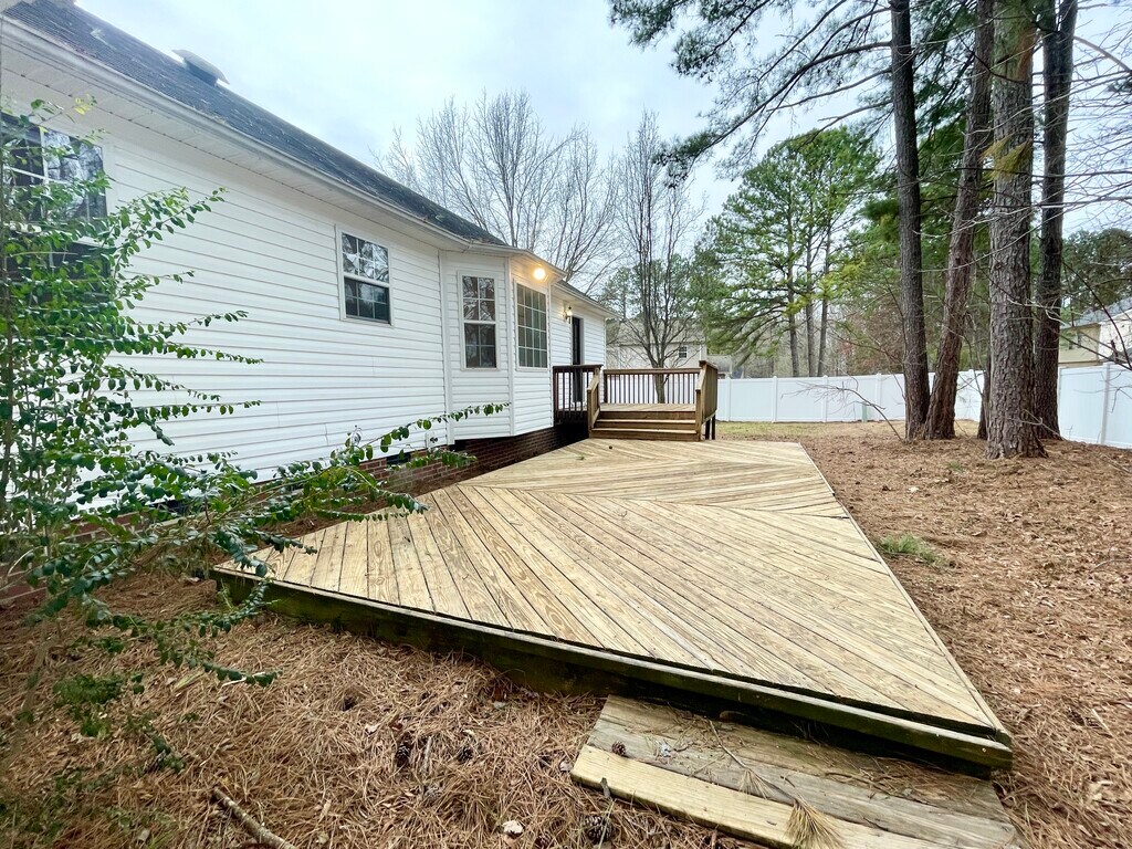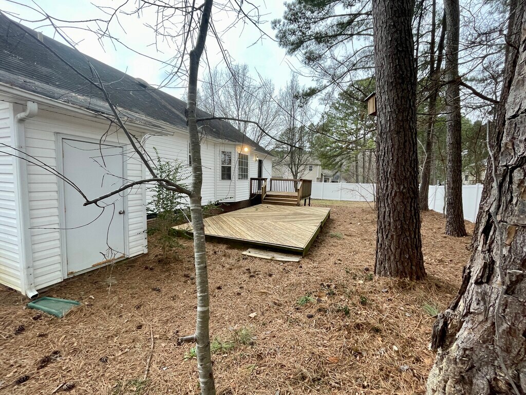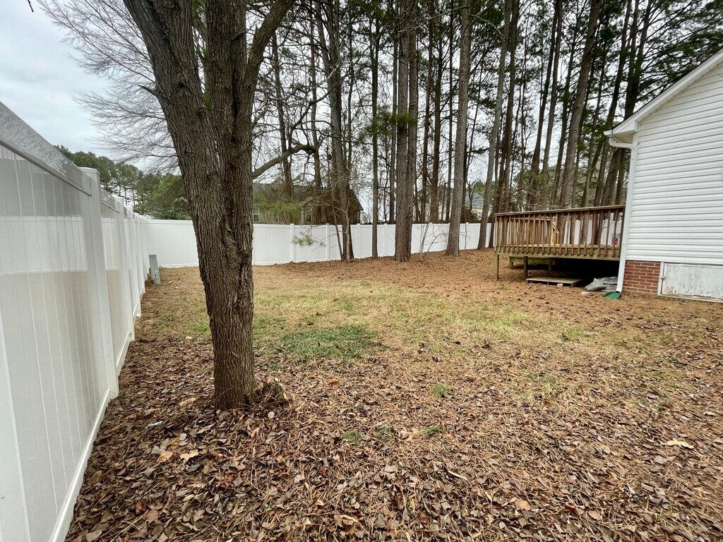 This classic ranch home is located on a quiet cul-de-sac in the Covington Cross subdivision, just minutes from I-540 with easy access to Raleigh. The home sits on a large, wooded corner lot and is fully enclosed by a 6-foot privacy fence, offering exceptional privacy and outdoor space. Inside, the home is freshly painted throughout and features refinished hardwood floors in the main living areas with new vinyl plank flooring in all bedrooms. The primary suite includes a spacious bedroom, private bathroom, and walk-in closet. Two additional bedrooms are well-sized with generous closet space. The property offers ample storage throughout and a large rear deck, ideal for outdoor living and entertaining. Covered front porch and driveway parking add everyday convenience. Pet-friendly. Quiet setting with mature trees, privacy fencing, and convenient highway access—ideal for long-term tenants seeking space, comfort, and location. First months rent and a refundable security deposit due up front -Income minimum: $5, 355 monthly pre-tax. -Credit score minimum: 650 (600-649 may be considered pending other factors w/ additional deposit requirement.) -Lease term min: 12 months shorter term considered at a premium rate. -Section 8 is not accepted. -Washer/Dryer hook-ups available. Washer/Dryer not provided. -Cats and Dogs are permitted with additional fee. $25 monthly per pet. Max of 3 Pets allowed. Application fee: $60 per adult or $100 per married couple.