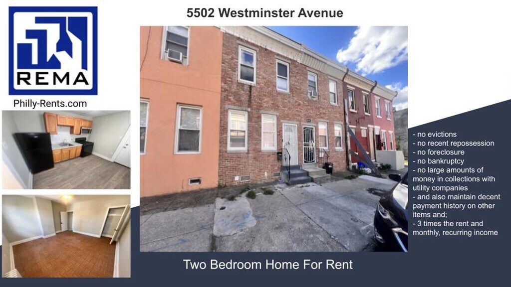 Virtual Tour: Located at 5502 Westminster Ave in the heart of West Philadelphia, this beautifully refreshed home offers a perfect blend of classic charm and modern updates. The main level welcomes you with a cohesive, contemporary aesthetic featuring gray vinyl plank flooring, neutral gray walls, and crisp white baseboards throughout. The heart of the home is the well-equipped kitchen, which boasts warm honey-toned cabinetry, granite-style countertops, and a sophisticated marble-effect tile backsplash. Moving into the kitchen is a breeze for any home chef, as it comes fully loaded with a gas range, over-the-range microwave, and a full-size refrigerator. The inviting living area sits adjacent to the kitchen, bathed in natural light and providing a seamless flow for entertaining or daily relaxation. Just beyond the main living space, the home extends its utility with a versatile secondary room and a convenient laundry area featuring an included washer and dryer. For those who enjoy the outdoors, the property includes a private, fenced, and paved backyard—ideal for summer gatherings or a low-maintenance urban retreat. Upstairs, the private quarters consist of two comfortable bedrooms and a full bathroom complete with a soaking tub. Every inch of the interior has been newly painted, ensuring a move-in-ready experience that feels fresh and bright. Combining the character of a classic West Philly layout with essential modern amenities, this single-floor living unit (with upstairs sleeping quarters) offers a practical and stylish sanctuary in the 19131 zip code. Qualifications / Sample Screening Criteria - Rental applications must be complete, correct, and verified - Gross monthly verifiable income at least three times the rent, or the tenant must have a housing choice voucher - Applicants must have a proven history of on-time rental payments, not including the COVID-19 emergency period - Applicants must have a good, relevant credit history - Applicants must have no evictions in the last four years except during the COVID-19 emergency period "Although deemed accurate, this information is subject to errors, omissions, and changes without notice." Lease Terms: Needed at leasing signing: (1st months, last months & security) 3x Minimum monthly income (before taxes) needed to qualify: 3x rent $ Decent/good credit _______________________________________________ Real Estate Management Advisors, LLC - REMA Licensed Real Estate Broker Property Manager Servicing Commercial & Residential Properties in the Philadelphia area. Consumer Notice - Real Estate Management Advisors, LLC in an exclusive agent of the landlord. Not the one for you? Let’s find it together: We can be social too: