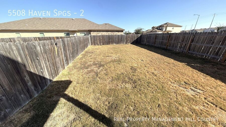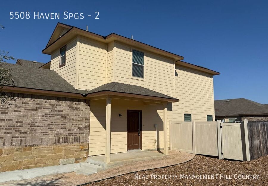 Corner lot! This 3-bedroom, 2.5-bath duplex is designed for modern living. The spacious open-concept layout connects the kitchen, dining, and living areas, featuring high ceilings and plenty of natural light. The kitchen boasts granite countertops, stainless steel appliances, and a peninsula that offers additional counter space and seating—perfect for everyday meals or entertaining. Durable LVP flooring downstairs combines style with easy maintenance. Upstairs, the main bedroom suite features a vaulted ceiling, walk-in closet, and a private bathroom with double vanity sinks, granite countertops, and a stand-in shower. Laundry hookups for a full-size washer and dryer are conveniently located upstairs. Enjoy relaxing outdoors on your covered front porch or covered backyard patio, with an HOA-maintained front yard for hassle-free upkeep. A two-car garage provides plenty of parking and storage space. All RPM Hill Country residents are enrolled in the Resident Benefits Package (RBP) for $50/month which includes renters insurance, HVAC air filter delivery (for applicable properties), credit building to help boost your credit score with timely rent payments, $1M Identity Protection, move-in concierge service making utility connection and home service setup a breeze during your move-in, our best-in-class resident rewards program, and much more! More details upon application. Community Playground Hoa Dues