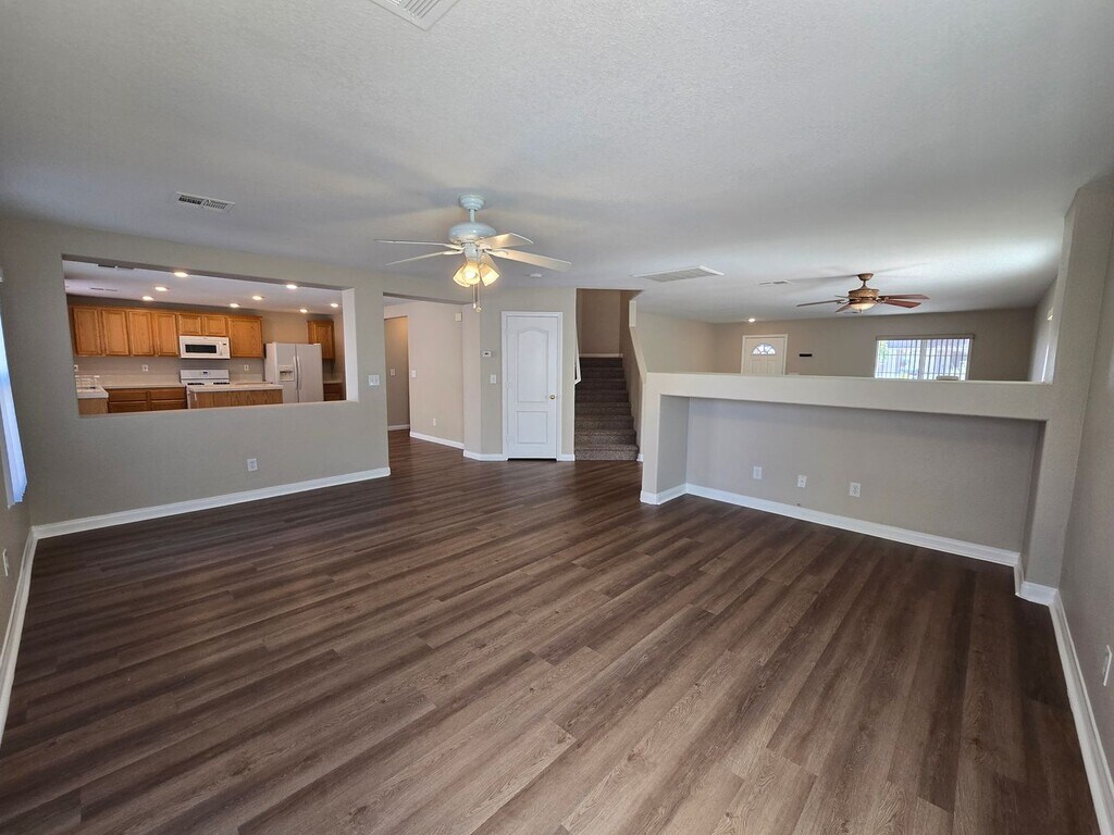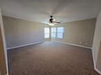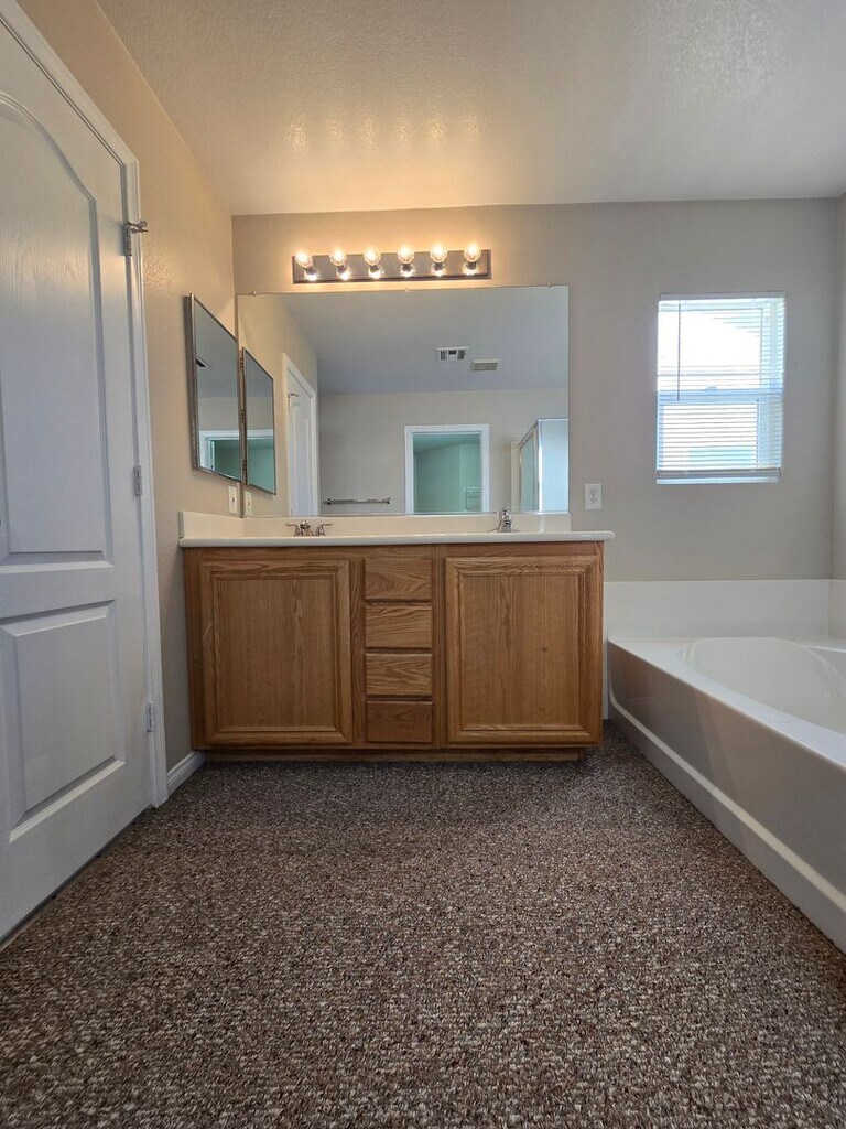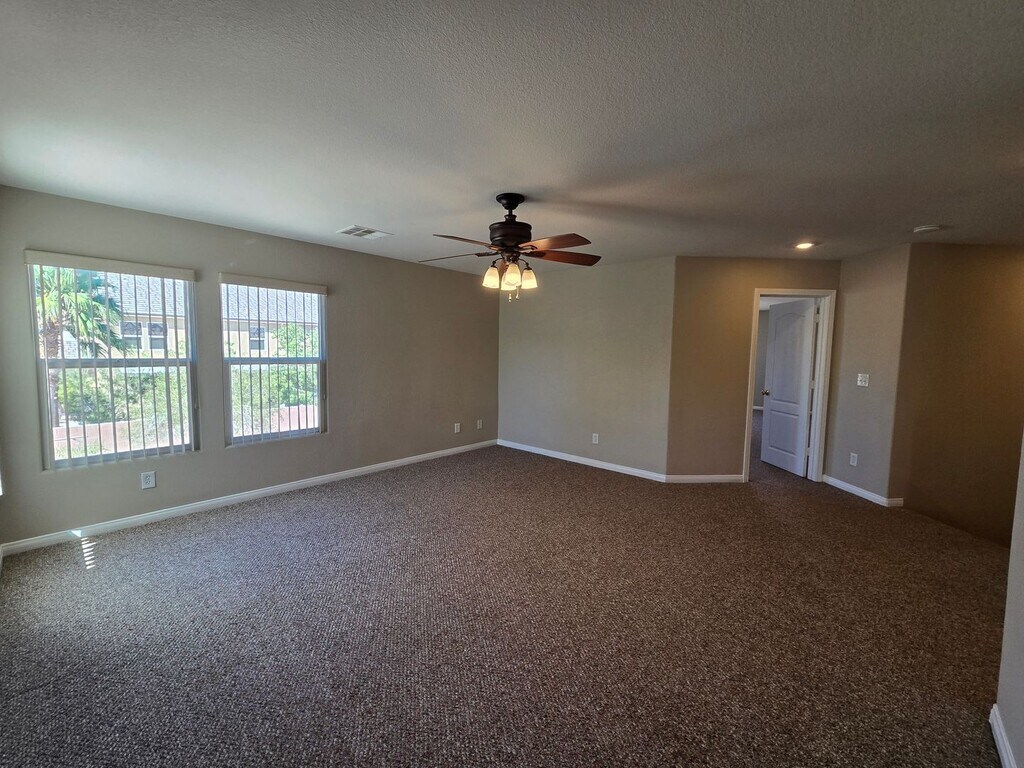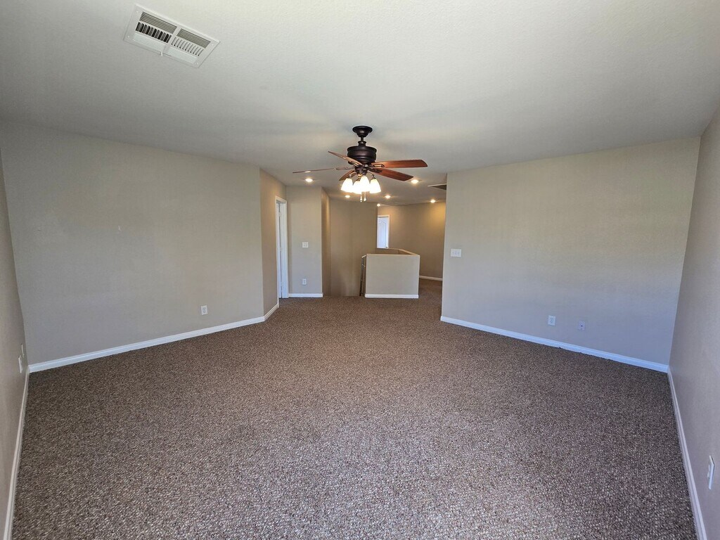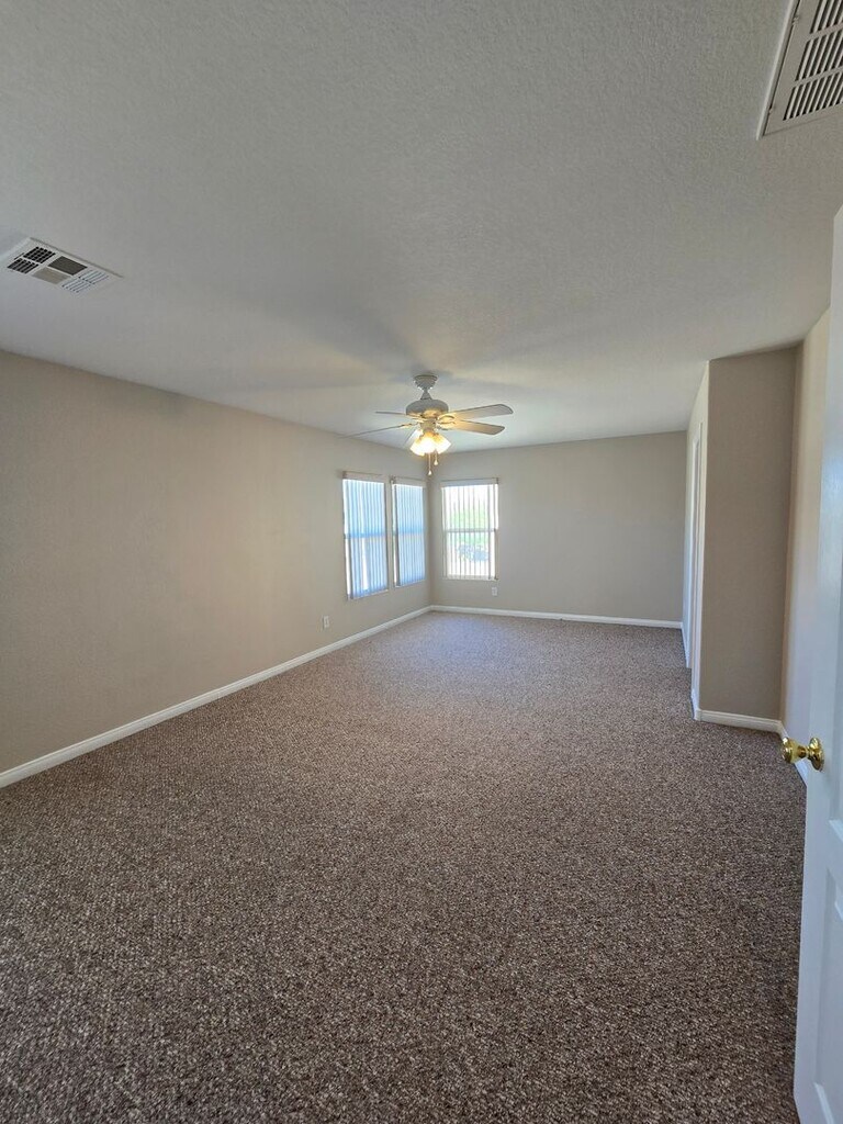 Welcome to this beautifully maintained 4-bedroom, 2.5-bathroom, 2-car garage home featuring a spacious floor plan and fresh paint throughout. The downstairs boasts luxury vinyl plank flooring, while the upstairs and all bedrooms are comfortably carpeted. The large kitchen includes an island and comes fully equipped with all appliances. Ceiling fans are installed throughout the home for added comfort. Upstairs, you’ll find a generous loft space—perfect for a second family room, home office, or play area. The primary suite offers dual sinks, a walk-in closet, and a relaxing retreat feel. Step outside to a large backyard with mature desert landscaping and a covered patio, ideal for outdoor enjoyment year-round. This home truly has it all—schedule your tour today before it’s gone! Please note that the rent includes a $100/Mo for Sewer, Trash, and the Resident Benefit Packet. Please call