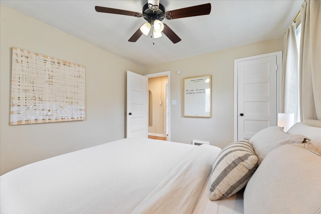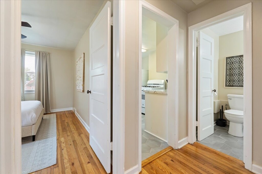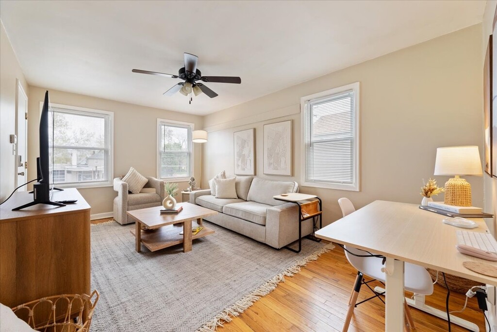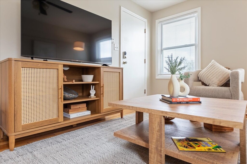 This spacious one-bedroom apartment features beautiful hardwood floors and upgrades throughout. Our L-shape sofa is the perfect place to lounge after a full day of exploring the city. Stream all your favorites on our 55" in TLC Roku Smart TV while curling up on the couch. Fall into Bed and truly unwind in our bedroom that doubles as a retreat. A luxurious firm Queen bed and white noise machine will give you the sleep that dreams are made of. The perfect spot to devour your favorite novel. Try on all our best outfits in our stylish leaning mirror before hitting the town. Spacious kitchen and stocked with all the essentials outfitted for the chef in the family. Central Air is a delightful reprieve from the Summer heat and efficient central heat makes the space super cozy in Winter. On-site parking is available and yet we recommend leaving the car behind and walking to dozens of bars and restaurants nearby!