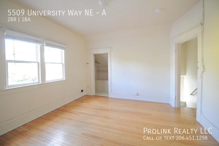5509A University Wy NE, Seattle, WA 98105 Terrific UW location! LAST 2BR unit available for Fall 2026 Prelease! Please email for more pictures/information or to schedule a tour! Lovely, well-maintained 2BR/1BA apartment in the heart of U-District: A sunny upper-level unit with hardwood floors, BA updated with newer window and floor (2023)! Unit includes a Living Area, Kitchen with Oven/Range and Refrigerator, plus access to shared on-site Washer/Dryer. Located near UW campus and Ravenna Park, with easy access to U Village, shopping, restaurants, coffee shops, public transit (Metro bus lines and Sound Transit Link Lightrail)! One shared off-street parking only (first come, first serve), street parking available. * Tenant responsible for electric/Internet; rent includes charges for the reasonable usage of standard water/sewer/garbage/gas services by two adult occupants only * 5509A, $1,720.00/mo: 2BR, 1BA, Kitchen, Living Area * See more pictures: * The information above has been given to us by the Owner or sources that we deem reliable. We have no reason to doubt its accuracy, but we do not guarantee it. Prospective tenants should carefully verify all information contained above * Address: 5509A University Wy NE, Seattle, WA 98105 * Available 9/12 * No Smokers, No Pets * Terms: Minimum 12 months; NO summer-only, short-term, or month-to-month leases. 1st Month's Rent and Last Month's Rent due at lease-signing; refundable Security Deposit equaling half of one month's rent due at start of lease * Satisfactory credit check, background check (where applicable), and rental references required for all applicants and expected co-occupants aged 18 and over; non-refundable application fee (as charged by screening agency) is $45.00 + tax per applicant * No deposits accepted until application is processed and approved * Leased by Prolink Property Management, LLC, 14670 NE 8th St, Ste 168, Bellevue, WA * Equal Opportunity Housing: We are pledged to the letter and spirit of U.S. policy for the achievement of equal housing opportunity throughout the Nation. We encourage and support an affirmative advertising and marketing program in which there are no barriers to obtaining housing because of race, color, religion, sex, handicap, familial status, or national origin.