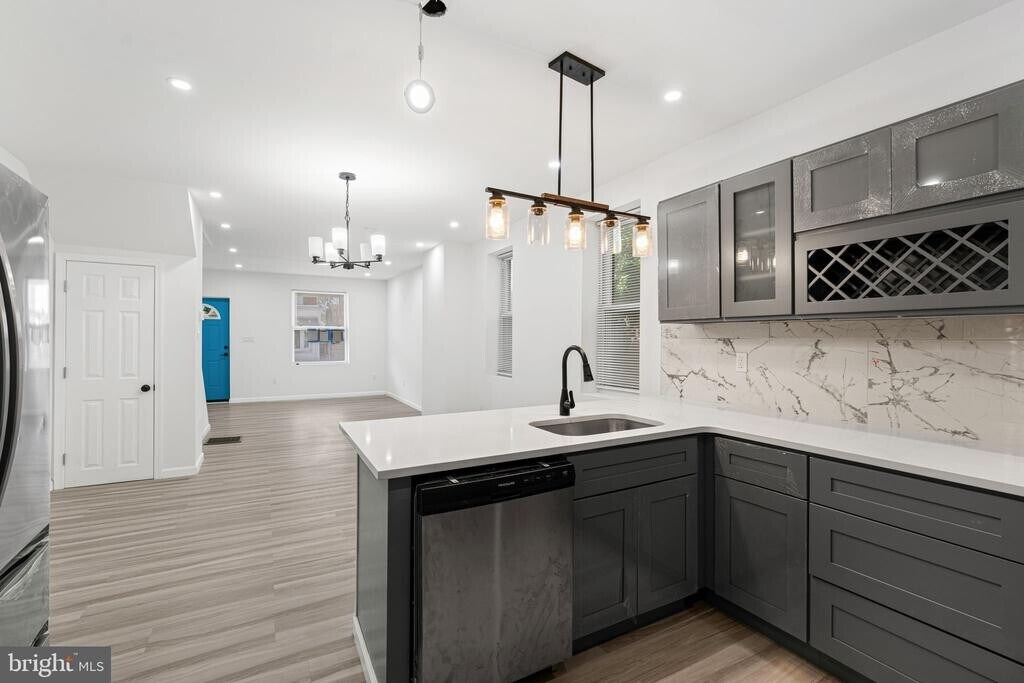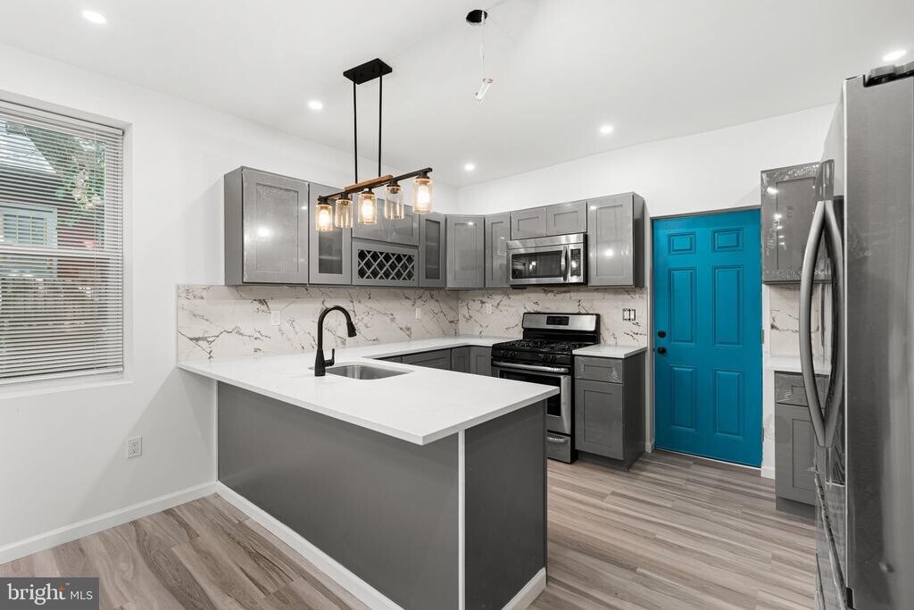 Available for Rent. is This beautifully renovated 2-story End row home located in the heart of the Kingsessing neighborhood of Southwest Philadelphia. This charming 3-bedroom, 2-bathroom residence blends classic character with modern upgrades. Step inside to find an open floor plan that features large living room, dinning room and a stylish modern kitchen with breakfast bar, granite counter tops, soft close gray shakers, with wine cabinet, accented back splash, and stainless steel appliances. Home is loaded with recessed lights and gleaming wood flooring throughout.. Both bathrooms have been tastefully updated. Situated on a desirable corner lot, this home is bathed in natural light and features a fully finished walk-out basement—ideal for a home office, gym, or extra living space. The spacious primary bedroom with large closet is complemented by two additional generously sized bedrooms, making it a great fit for families or guests. Additional features include central heat and air, and fenced rear yard. With a total of 1,850 square feet of finished living space and easy access to public transportation, parks, and city amenities, this home is move-in ready and waiting for you. . Schedule your private showing today!