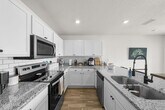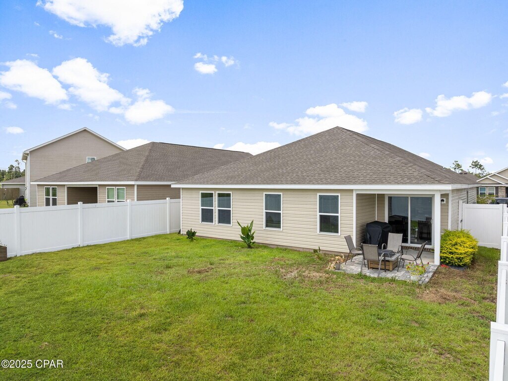 Welcome to this well built Century 4-bedroom, 2-bathroom Covington floor plan home located in the desirable Butler Farms community. Designed with comfort and functionality in mind, this home features an open-concept main living space with durable vinyl flooring, while the bedrooms offer soft carpeting for added warmth. The kitchen is the heart of the home, boasting ample cabinetry, a breakfast bar, stainless steel appliances, and sleek granite countertops--perfect for both everyday living and entertaining. The master suite is a private retreat with a spacious walk-in closet and an en-suite bathroom featuring a double vanity. This split-bedroom floor plan provides privacy, with three additional bedrooms located away from the master suite. Each secondary bedroom offers closet space, cozy carpeted flooring, and easy access to the second full bathroom, making them ideal for family, guests, or a home office. Step outside to a fully fenced backyard, complete with a patio and extended pavers--ideal for outdoor gatherings, grilling, or simply relaxing. the back yard of this homes faces east offering shad in the warm summer afternoons. This is a small community that backs up to greenspace with excellent drainage and sits on a dead end street.Perfectly situated, this home is just 1.1 miles from H.G. Harders Park, 17 miles from Tyndall Air Force Base, and 29 miles from the white sandy beaches of Panama City Beach. You'll also enjoy close proximity to shopping, dining, schools, and entertainment, making this property as convenient as it is inviting.