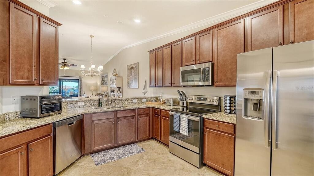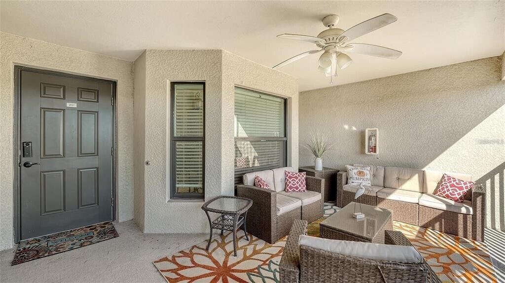 This stunning,light,bright,fun coastal furnished condominium features 2 bedrooms,2 bathrooms plus a den set up as additional sleeping quarters. This condo is ready to welcome you home to a vacation of simple bliss. Relish in the splendid lifestyle of living,working and playing within this gated resort style Community on Florida's Gulf Coast. This end unit offers a clever open layout and provides lovely golf course views evoking a sense peacefulness within this open floor plan. Enter the through the welcoming front lanai and be greeted by the grand kitchen with vaulted ceilings and plenty of open space to become the aspiring chef of your dreams,featuring granite countertops,rich wood cabinetry,a breakfast bar and center island with seating. This property is made for entertaining family and guests alike with plenty of room to linger in the open concept kitchen,dining/living room and out onto the front and back screened lanai's bringing the outdoors in to reveal lovely views and calming breezes as you enjoy meals and beverages. A generous guest bedroom is situated at the front of the home with easy access to the spare bath,while providing privacy to the gracious master suite located at the rear of the home,featuring a king bed with two walk-in closets and an en-suite bath with walk-in shower. The unit is further enhanced by a designated 1 car garage allowing easy access and storage your car and golf clubs. Plenty of guest parking is available. LWN is a golfers dream. Amazing amenities feature; spa - fitness - resort style pool - Tiki Bar with food service,har-tru tennis courts,pickle ball and a 28,000 square foot clubhouse that will offer additional food and beverage options. Golf membership available for purchase. $65.00 monthly minimum expenditure is required for on-site food and beverage (alcohol excluded). Come live the dream and enjoy the Florida Lifestyle in this stunning condominium! This property is available for LONG or Short Term Rentals. MLS# A4687315