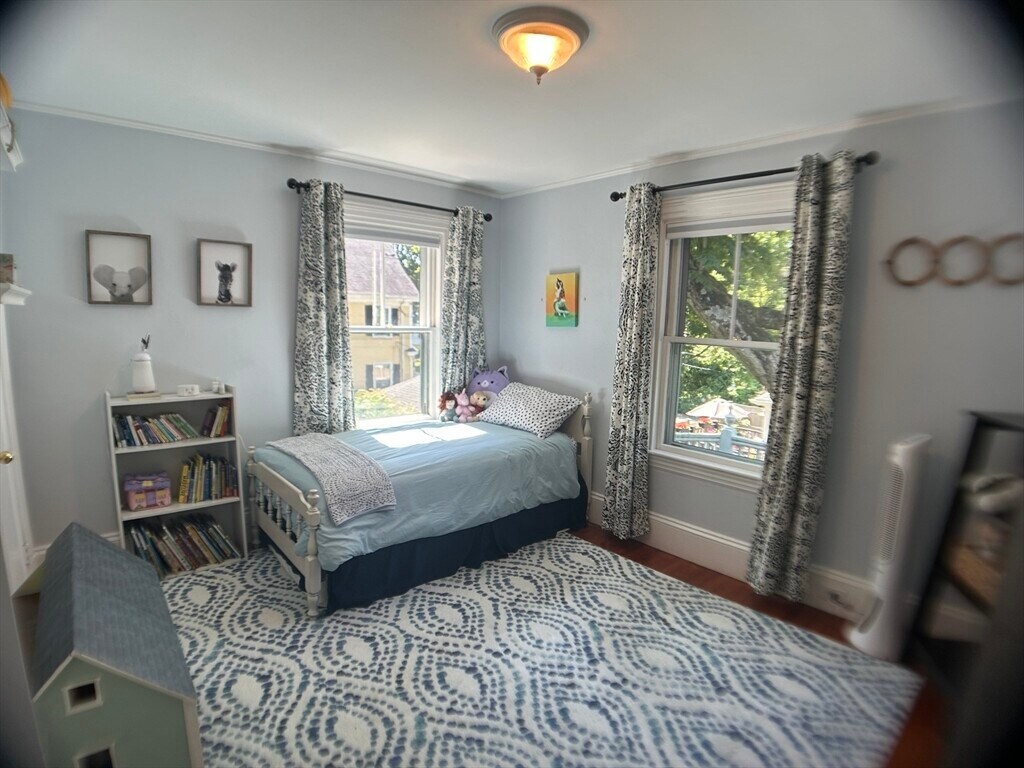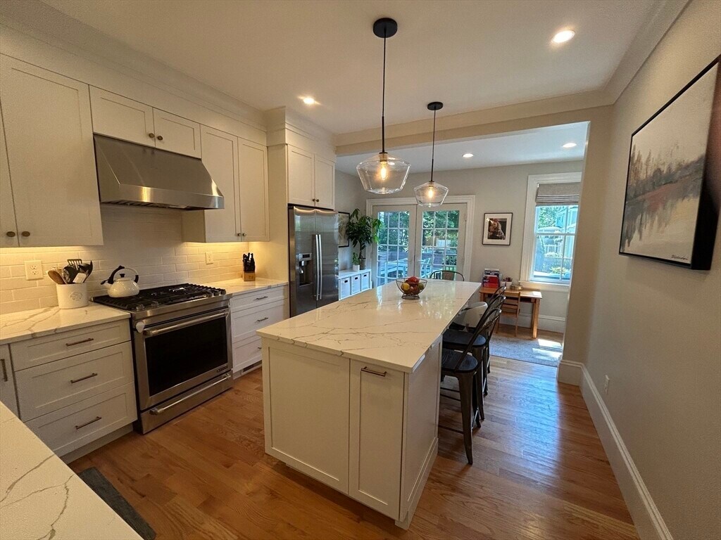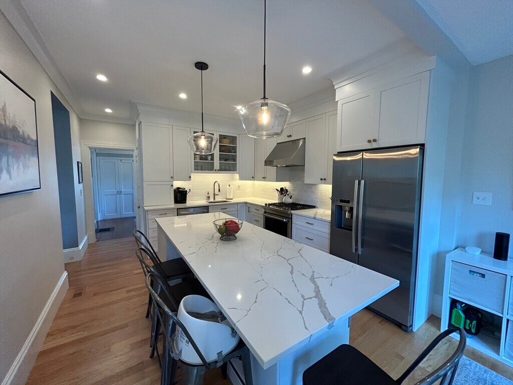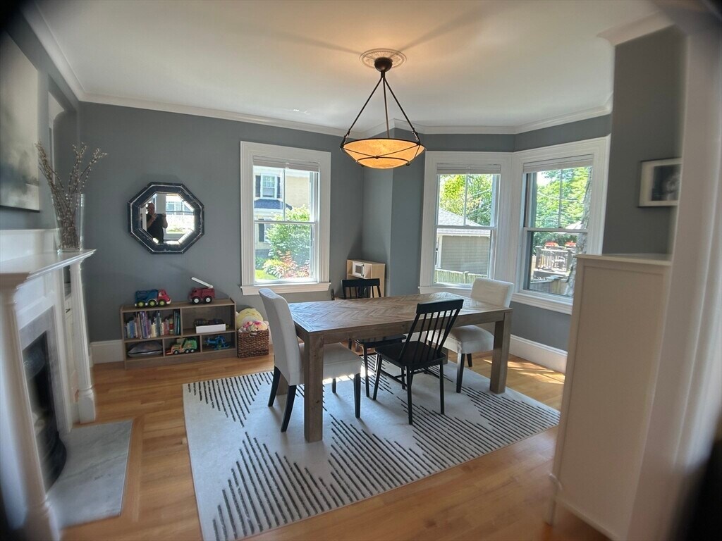 Charming Colonial Victorian located in family-friendly area of Dedham’s desirable Precinct 1. A spacious foyer with ample closets leads to a bright,sun-filled kitchen with quartz counters,center island with built-in microwave,stainless appliances and subway tile. French doors open to a deck overlooking fenced-in rear yard with new,secured gates on either side. Yard well maintained and supported by irrigation system. An updated powder room,decorative fireplaced dining room with built-in dry bar and living/family room complete the first floor. Second level offers three bedrooms,one with "Elfa" closet systems,recently renovated full bath,and spacious home office/playroom. Third level boasts a bedroom with ensuite walk in shower and spacious closets. Central Air and custom window treatments. A short walk to Dedham's vibrant downtown. Easy access to 95,128,and commuter rail to Boston. MLS# 73414277