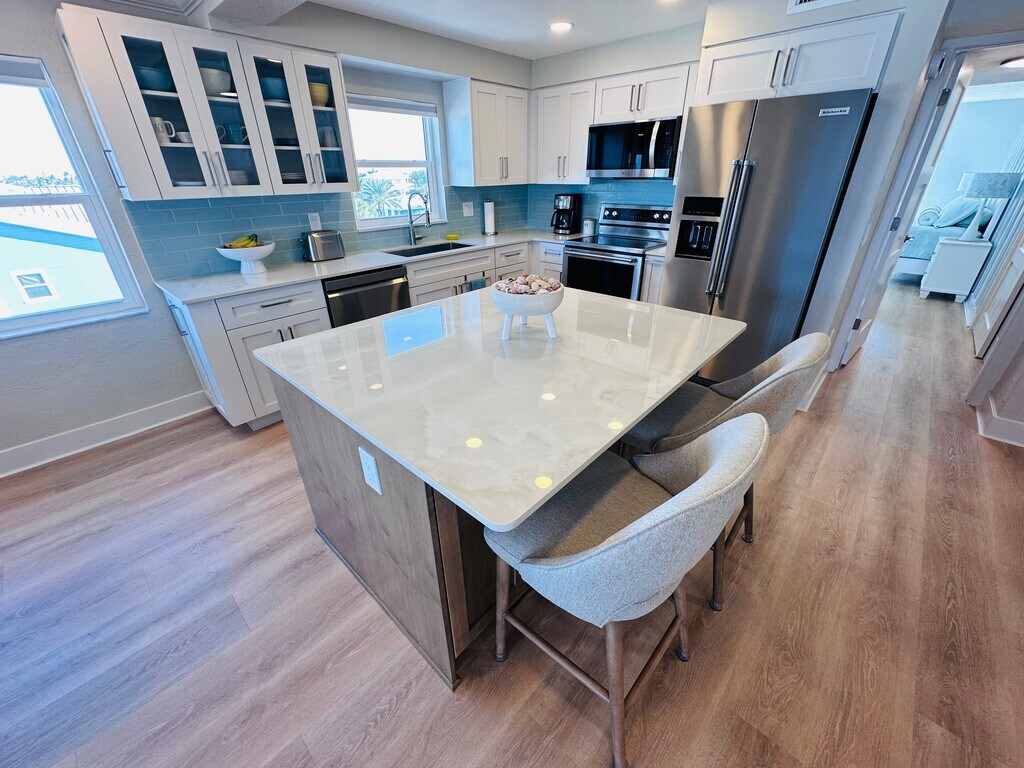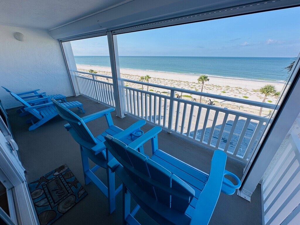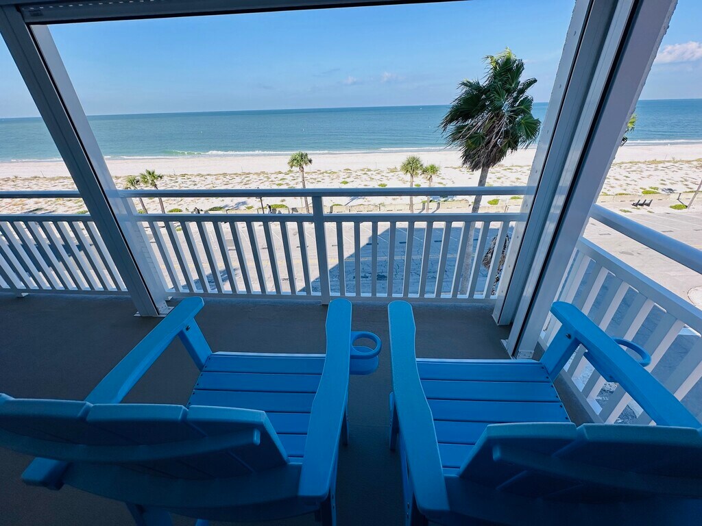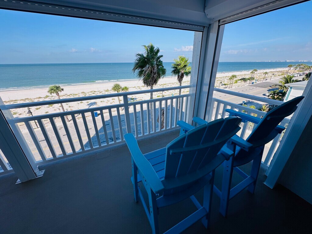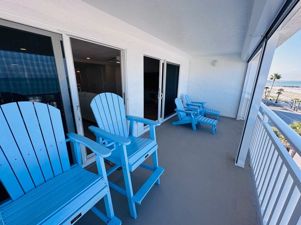 Welcome to your sea-to-sea sanctuary in the heart of Pass-a-Grille!!! This beautifully remodeled 2-bedroom, 2-bath residence is perched on the 5th floor of 555 Gulf Way, directly across from the sugar-sand shoreline. The home offers rare, wide-open views stretching across Pass-a-Grille Beach, St. Pete Beach, Treasure Island, and Egmont Key. Sunsets are your nightly backdrop, the breeze off the Gulf fills the rooms, and the easy, relaxed rhythm of island living begins the moment you arrive. Inside, the unit is bright, spacious, and thoughtfully updated throughout. The open living and dining area frames the Gulf and horizon, creating a stunning view from morning to night. A large flat-screen TV is perfect for unwinding after a day on the beach. The fully remodeled kitchen features sleek stainless steel appliances, generous counter space, and all essentials for long stays. A large washer and dryer are located inside the unit for convenience. This 2-bedroom, 2-bath layout sleeps a maximum of 4 guests with a king bed in the primary suite and a queen bed in the guest room. Both bedrooms overlook the Intracoastal Waterway, giving you true sea-to-sea visibility sunrise to sunset. Both bathrooms are fully renovated with modern finishes and walk-in showers that create a calm, spa-inspired atmosphere. Step out onto the private balcony to take in 170-degree panoramic Gulf views. Watch sailboats drift by in the afternoon, enjoy coffee in the morning light, or relax at sunset as the sky turns cotton candy pink. Adirondack loungers, high-top seating, and side tables make this balcony a true extension of the living space. Beach chairs and gear are provided. Reserved parking and guest parking are available. The elevator opens directly to your front door, and two stairwells on the east and west sides offer quick access to the beach or village. Wi-Fi and cable are included, along with all utilities. Just two beach blocks north is the historic Pass-a-Grille village district, home to waterfront restaurants, rooftop bars, local shops, galleries, and the iconic fishing pier. Charter a boat to Shell Key Preserve, Egmont Key, Fort De Soto, or head into the Gulf for world-class fishing. This is one of the last true Old Florida beach towns, where life moves slower, the water is always sparkling, and the sunsets are unforgettable. Monthly/seasonal rates are as follows: 2026 January $8,000 February $9,000 March $10,000 April $8,000 May $6,000 June $6,000 July $6,000 August $5,000 September $5,000 October Blocked for Owner Use November Blocked for Owner Use December $7,000 2027 January $9,000 February $10,000 March $10,000 April $9,000 May $6,000 June $6,000 July $6,000 August $5,000 September $5,000 October Blocked for Owner Use November Blocked for Owner Use December $7,000 Additional Info: All Utilities Included Cleaning Fee $200 Damage Waiver $99 Sleeps 4 Maximum 30 Day Minimum Stay Required