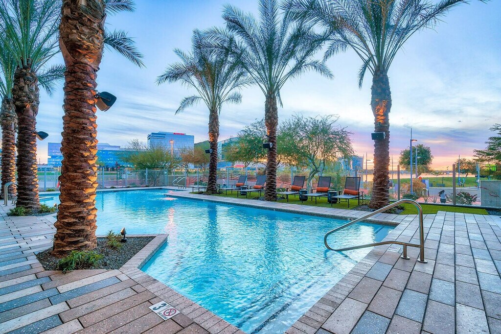 Feel at home in this newly built Tempe condo on Town Lake. Centrally located on the river, the park, watersports, and the greater Phoenix/Tempe/Scottsdale area, this condo is perfect for leisure, spring training, and business travelers! This cozy apartment is suitable for a family, group of friends, or business travelers and has all of the amenities necessary to enjoy your stay. It features quartz countertops, stainless steel appliances, a fully equipped kitchen, 100mbps+ internet, modern decor, and a Smart-TV with streaming apps installed. Also included are a washer and dryer, and complimentary coffee. Great amenities await you, including stunning lakefront views exclusively from the club room, a luxury fitness center, access to Tempe Town Lake amenities, and a pool with spa cabanas and fire pits, with pool access where allowed by season and weather! Free parking is available first come first serve, or for $5 per day in the garage if the free surface lot is full or if you desire garage parking. An additional pet fee of $100-300 based on stay length is collected separately, with a maximum of 2 pets (40lbs combined) allowed, excluding Pit Bulls and Bull Mastiffs or similar breeds. This apartment is on Town Lake River in Tempe, Arizona near the Mill Avenue District, a local hotspot for dining, shopping and entertainment. Situated just 11 miles outside of Phoenix and 4 miles outside of Scottsdale, Tempe is a vibrant city all its own with beautifully landscaped parks, botanical gardens, and wildlife preserves such as the Hayden Butte Preserve. You can also enjoy the close proximity to the Phoenix Zoo, Scottsdale Civic Center, Tempe Diablo Stadium, and Kiwanis Park. Smoking of any kind is not permitted within or outside of this apartment, including balconies, patios, or common and/or parking areas. Any sign of smoking is a violation of the stay agreement, which may result in immediate termination and recovery fees beginning at $500. There is a $200 penalty for removing smoke detectors and a $200 penalty for lost key fobs. No outside guests are allowed without permission. Guests must agree to not disturb neighbors at all times during the stay and must observe quiet hours from 9pm-8am each day. The home is proactively monitored with decibel sensors for compliance with this noise policy. Check-in is at 4 PM and check-out is at 11 AM, with a $75 per hour late fee. One towel per guest per stay is provided. A valid photo ID is required to complete the booking. The minimum age requirement of the primary person booking should be 22 years old for out of town guests and 25 years old for local guests. No weapons or drugs are allowed; police will be called for violating this rule. Registration Number: STR-A-000970 [SI]