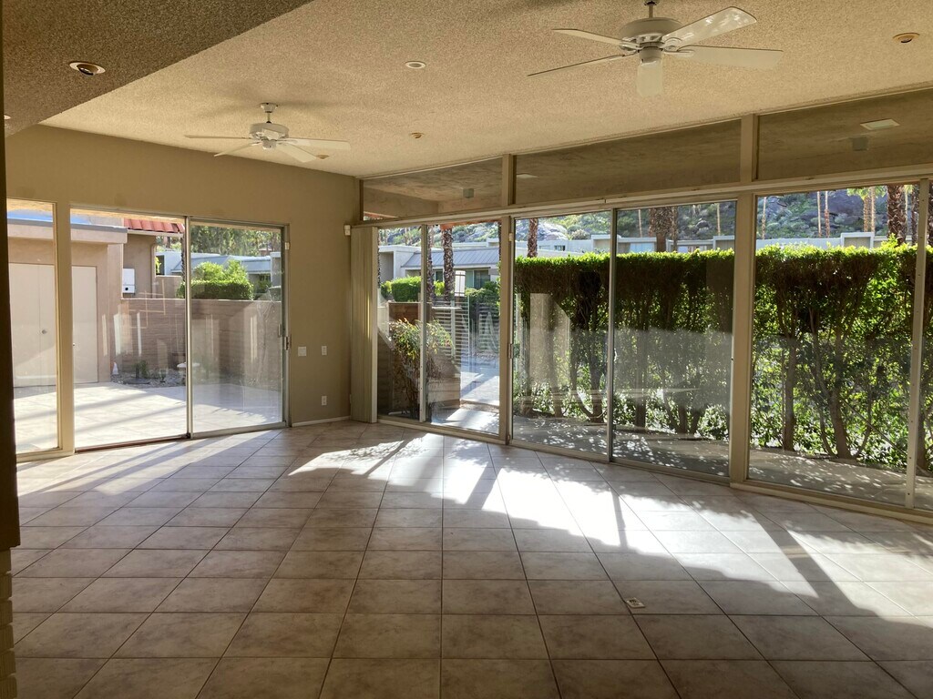 A RARE FIND! 3 beds,2 baths - Vacant- Ready to move in. 1+year lease minimum,NOT a vacation rental. Nestled in the heart of the Historic Tennis Club,this captivating three-bedroom,two-bathroom and (3rd bedroom can also be a den with spectacular built out den with a hidden wet bar.) This condo is a haven for those seeking a sophisticated and convenient lifestyle. Situated in the prestigious Tennis Club Condos,this residence offers the perfect blend of tranquility and accessibility. The location desirable,being near the vibrant downtown area and surrounded by scenic hiking trails. As you step inside,you are greeted by the elegance of a single-level floor plan with high ceilings that create an airy and spacious atmosphere. The primary bedroom is nicely separated from the other bedrooms. Incredible mountain views and a lovely fireplace. One of the distinctive features of this complex is its exclusive private back entrance to Spencer's Restaurant,allowing residents to indulge in fine dining experiences just steps away. For those who appreciate leisure,the newly refurbished pool and spa beckon,providing a refreshing retreat for relaxation and socializing. The covered parking adds a touch of convenience,with an additional assigned parking space as well. With its thoughtful design and prime location,this property offers a rare opportunity to experience the epitome of desert living in Palm Springs.