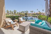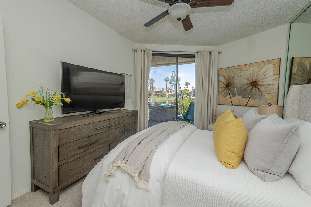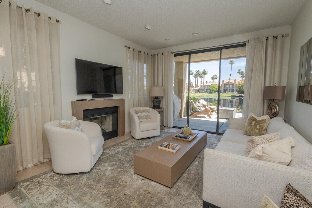 This rare premium location condo is the ''Champion floor plan,'' lower-level end unit and offers breathtaking lake views and mountains. Meticulously cared for with areas of remodeling is a gem two-bedroom condo. The stylish kitchen has new cabinets,soft close hinges with new quartz countertops,new recessed lighting,and upgraded appliances. A new sink and new faucet with a pull-down handle. The first primary bedroom,featuring a walk-in closet and ensuite bath,offers stunning views of the lake and patio area and is thoughtfully separated from the second primary bedroom (featuring a king size bed) for added privacy and a very nice updated en-suite. The extra storage is a wonderful feature for a condo. This home has not only been extremely well cared for - it has been loved and cherished by the owner,and you can feel the warmth and attention to the details once you come through the front door. This is one of finest Champion floor plan in PGA West and having gorgeous views of the lake from the living room,primary bedroom and outdoor patio is truly living the desert lifestyle. Attached garage large enough for car and golf cart. Long Term rent November 2025 thru October 2026 is $3,500/month. Seasonal rent November 2025 - April 2026 is $5,500/month.