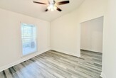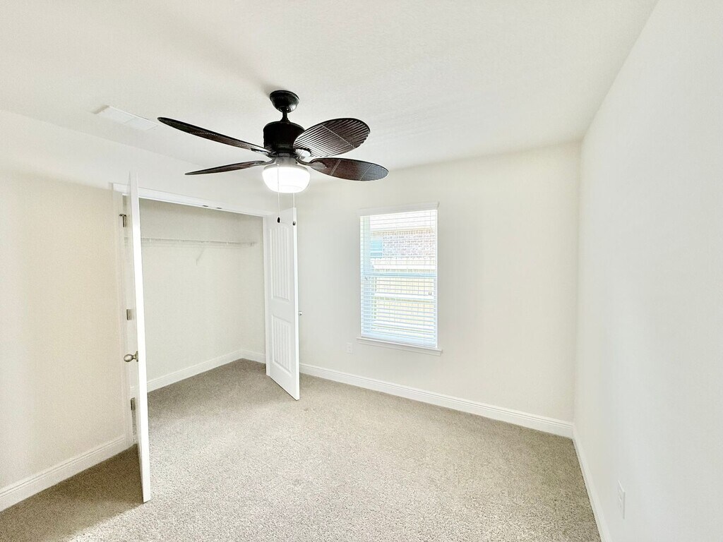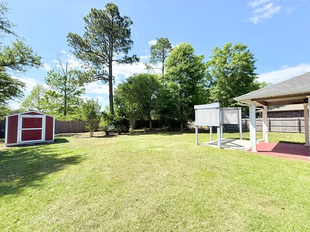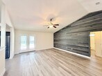 View In 3D: Located in the desirable Pace Mill Creek neighborhood, this spacious home offers 4 bedrooms, 2 full bathrooms, a 2-car garage, and 2,134 square feet of functional living space. The covered front porch with fenced enclosure provides a welcoming entry. Inside, the living area features luxury vinyl plank flooring, French doors leading to the backyard, and a stylish wood-paneled accent wall. The large open kitchen is perfect for entertaining, offering a center island with storage, dark wood cabinetry, a large, two-tiered breakfast bar, dual-basin sink, and stainless steel appliances including a refrigerator with bottom freezer drawer, flat-top range, built-in microwave, and a dishwasher. Just off the kitchen is a spacious tiled dining area. The primary bedroom features plush carpet, a tray ceiling with ceiling fan, and an ensuite bathroom with his-and-hers walk-in closets, dual vanities, and an oversized walk-in shower. Three additional bedrooms each include carpet, ceiling fans, and spacious closets, and share a second full bathroom with a single vanity and tub/shower combo. Additional highlights include a laundry room with shelving and space for a full-size washer and dryer, a covered back porch with ceiling fan and extended patio, a storage shed, and a large fully fenced backyard.
