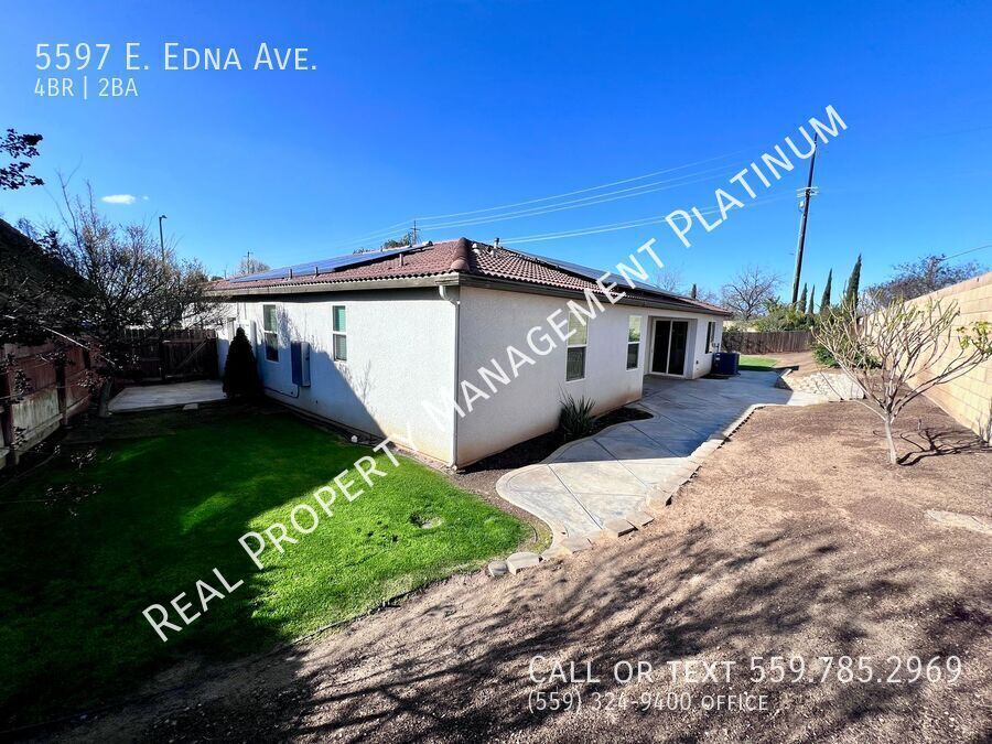 CLICK HERE to schedule a showing: 4 bedroom | 2 bathroom | 2,058 sq ft | 2014 Build Enjoy this Energy Efficient home with Solar Panels. Located in a Cul-de-sac, with private courtyard and beautiful landscaped yard. House opens to a spacious great room with views of the backyard. Modern Kitchen features granite countertops, stainless steel refrigerator, microwave, gas stove / oven, dishwasher / disposal. Separate dinning area. Ceiling fans throughout. Wood vinyl flooring. Primary bedroom has private access to backyard, a walk-in closet, en suite with walk-in shower, soaking tub, extended vanity with 2 sinks. 3 additional spacious bedrooms. 1 full guest bathroom with tiled shower / tub combo, and 2 sinks. Spacious Interior laundry room including a washer and dryer. Attached 3 car garage. Spacious Backyard, fully landscaped, with covered patio area. Yard Care is included for the first 3 months of lease term. Yes Pets. No smoking. Credit score above 650 REQUIRED. Renters Insurance is required. Solar panels, tenant pays PG&E, TrueUp, Fresno Utilities. Solar usage $200 a month. Cross streets Church & Clovis Ave. Clovis school district. Call to schedule a showing or to contact the office. DRE# 01901101. All information is deemed reliable but not guaranteed and is subject to change. Non Smoking Renter's Insurance Required