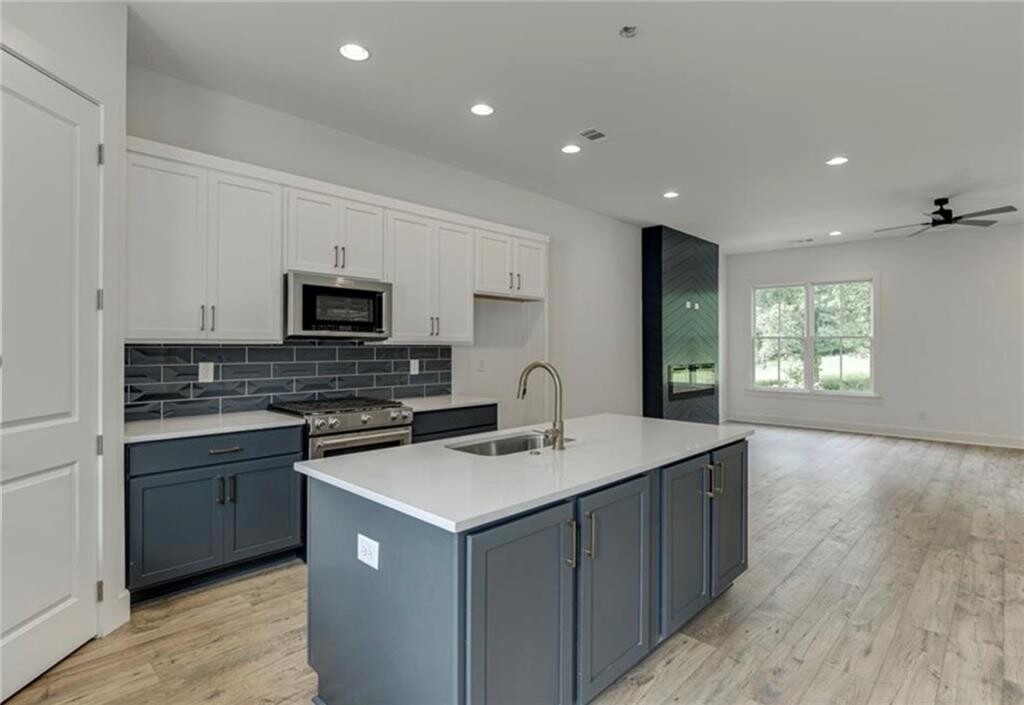 End unit large townhouse has 3 beds 2.5 baths with open concept living,dining and loft areas. Walk onto your covered porch and find an outdoor fireplace. Inside find a large family room w/10 ft. ceilings,casual dining,kitchen and a powder room. Kitchen features SS appliances,shaker style 42 inch cabinets w/modern trim,tile backsplashes,recessed can lighting and pendant lighting. Upstairs you will find a loft area-great for a study or media area,the primary bedroom w/spa like bath including a super double showers,double vanity w/makeup area and walk in closet. 2 large secondary beds w/walk in closets and another full bath complete the upstairs. Beautiful trending paint colors,designer LVP flooring,carpet and ceramic tile,8 ft. doors throughout,shaker style cabinetry and the latest styles of granite/quartz countertops have been specially picked for each unit. HOA includes lawn maintenance and limited exterior maintenance. This unique townhome community is located in the heart of downtown Flowery Branch with walkability to restaurants,shops,parks and Lake Lanier nearby. to I-985,shopping and North Georgia University Gainesville,Minutes away from many Lake Lanier parks. blinds and refrigerator is installed.